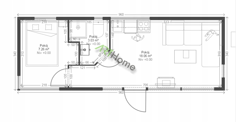 Сучасний, повністю ізольований цілорічний будинок, розміри 9,60 м x 3,40 м (довжина/ширина)