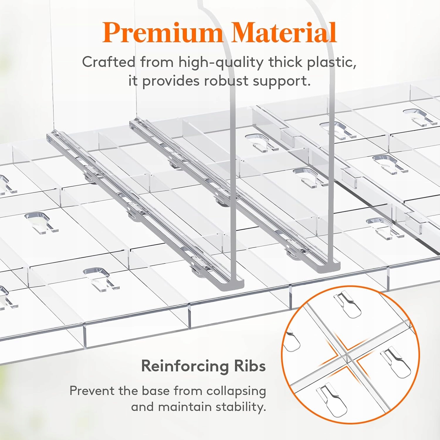 - Регульовані розділи: Набір організатора мішків містить два набори відділень, з двома базами та вісім відсіків, що дозволяє регулювати відстань до різних розмірів мішків. Це гарантує, що сумки стоять вертикально, підтримуючи свою структуру та запобігаючи деформації. 4 Конструкція з хвилястим краєм забезпечує делікатний дотик, захищаючи гардероб та одяг від пошкоджень