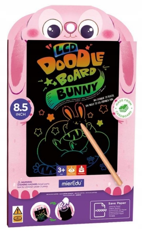 Малюйте, вчіться та розважайтеся без обмежень будь-де та без безладу! Барвистий планшет для малювання з мотивом милого кролика - незамінний компаньйон для повсякденних ігор і навчання як для дітей, так і для дорослих! Це дозволяє дітям вільно малювати, розвивати уяву, координацію очей і рук і розпізнавання форм і кольорів. Планшет стане в нагоді не тільки для створення малюнків, на ньому також можна тренуватися писати, рахувати або залишати короткі повідомлення, завдяки функції швидкого чищення однією кнопкою дитина може писати і стирати багато разів без паперу і без плутанини! Легкий і зручний, він ідеально підходить для подорожей в автомобілі, літаку або як практичний і творчий інструмент, який розвиває художні навички, вчить концентрації та забезпечує години творчих розваг, де б ви не були. Планшет виготовлений з екологічно чистих матеріалів, таких як папір і дерево, а діагональ екрану становить 21,5 см. Комплектація: планшет, дерев'яний стилус. Включає розряджену батарею CR2032. Для дітей старше 3 років.