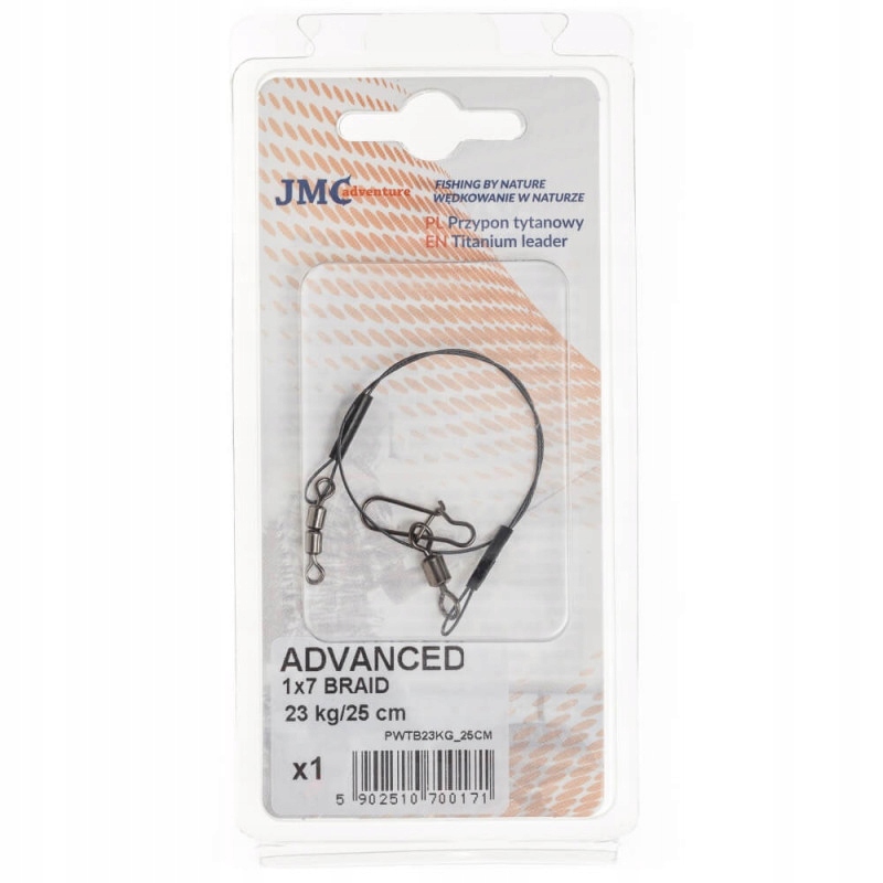 Поводок зі спеціального титанового сплаву – це дуже гнучкий матеріал, який розтягується під час нападу могутньої риби, поглинаючи силу удару? Після розтягування лідер повертається до початкового розміру, не втрачаючи своїх властивостей. Цей матеріал є абсолютним лідером серед інших рішень, які використовуються для виготовлення рибальських поводиків. JMC ADVENTURE пропонує семижильну титанову оплетку (titanium braid 1x7) і однорідну титанову проволоку (titanium wire), особливо рекомендовану для лову ривком. Обидва продукти доступні у ЗВИЧАЙНІЙ і РОЗШИРЕНІЙ