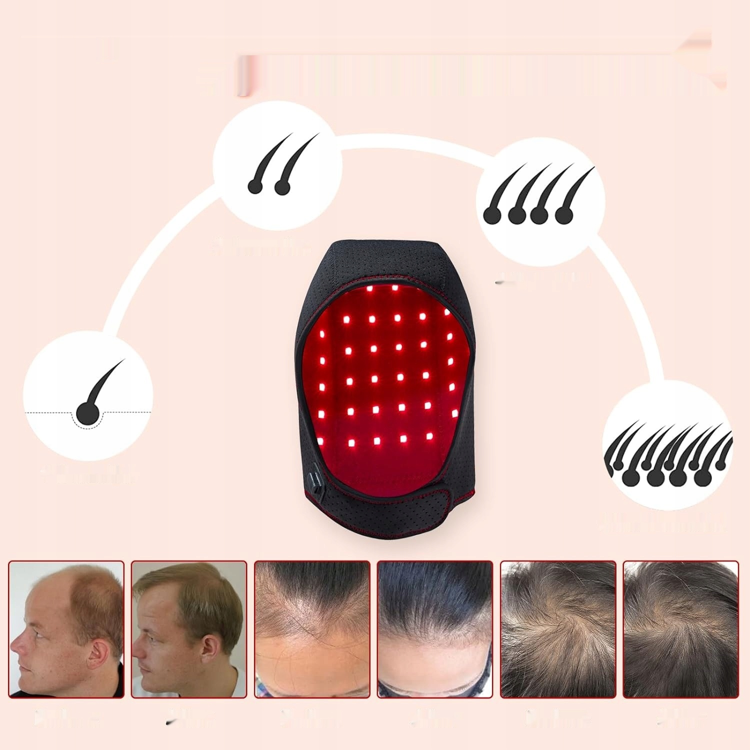 ✅ Відростити густіше волосся: ця терапевтична шапочка з трьома довжинами хвилі стимулює волосяні фолікули, усуває витончення волосся, сприяє відновленню волосся та робить волосся густішим, здоровішим і густішим для чоловіків і жінок. Він також може лікувати андрогенетичну алопецію, яка включає спадкову втрату волосся, чоловіче та жіноче облисіння, алопецію під час менопаузи, а також вікове випадання та витончення волосся.