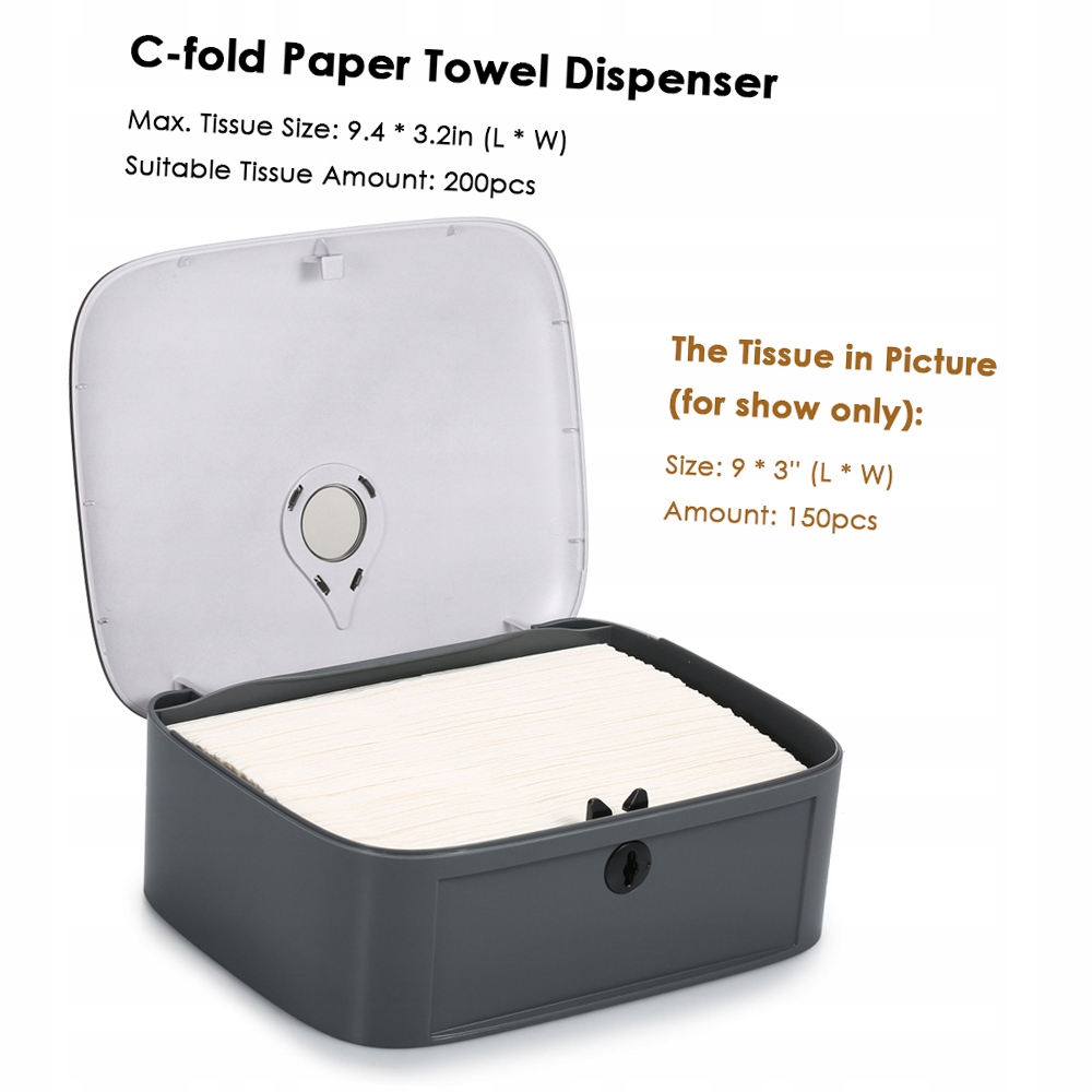 - Цей дозатор паперового рушника був розроблений для утримання паперового рушника C-разів. Функція, встановлена на стіні, є дуже ефективним простором і не вимагає буріння, не завдаючи шкоди стінці. Він також оснащений ключем, що забезпечує легкий вручну доступ до паперу.