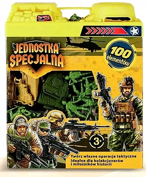 Цей повний військовий набір складається зі 100 елементів, включаючи маленьких солдатиків. Коженсолдат створено з увагою до найдрібніших деталей, що робить їх дуже реалістичними. Грайте з ними в коробці,яка служить командним центром для цих маленьких героїв.