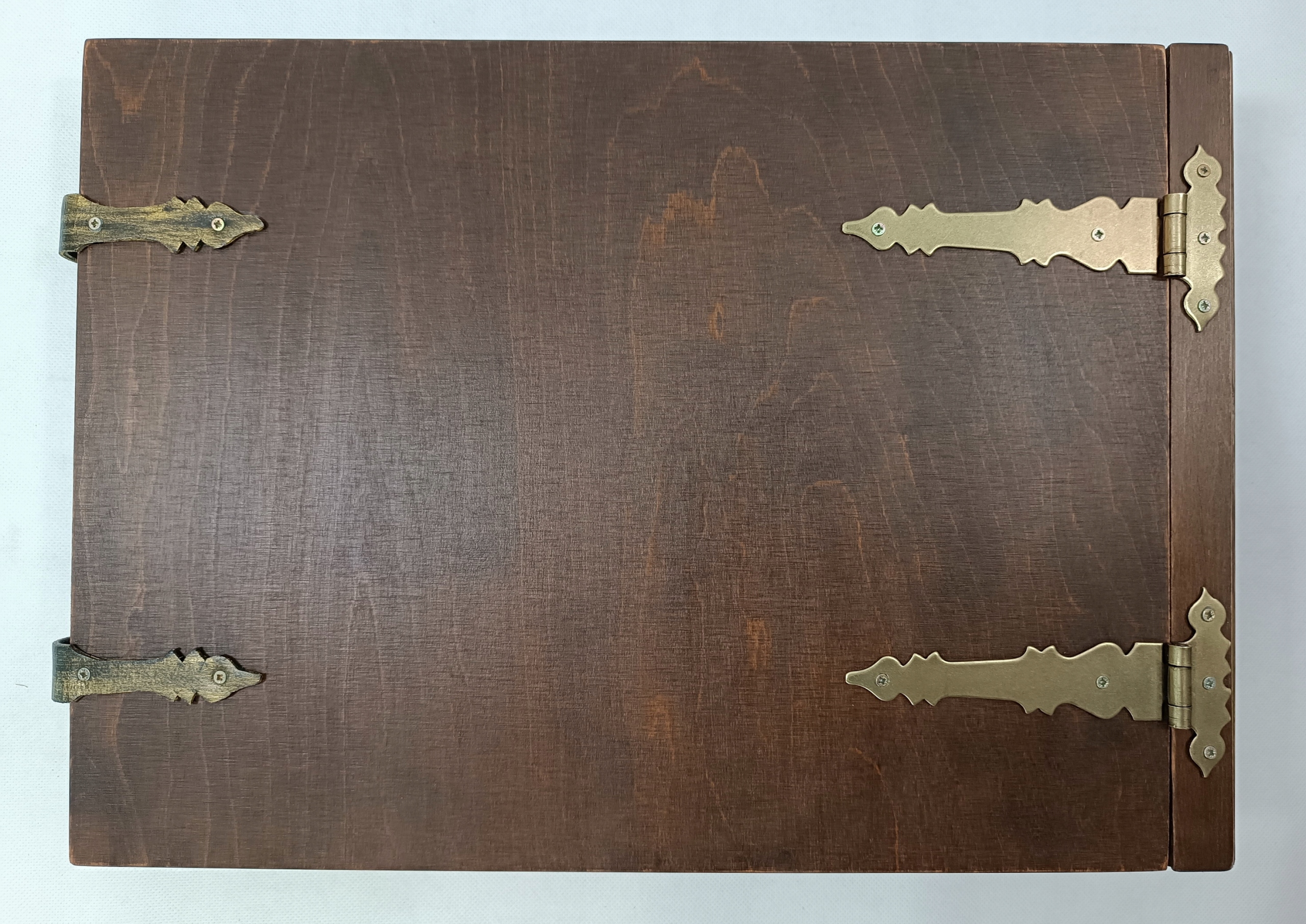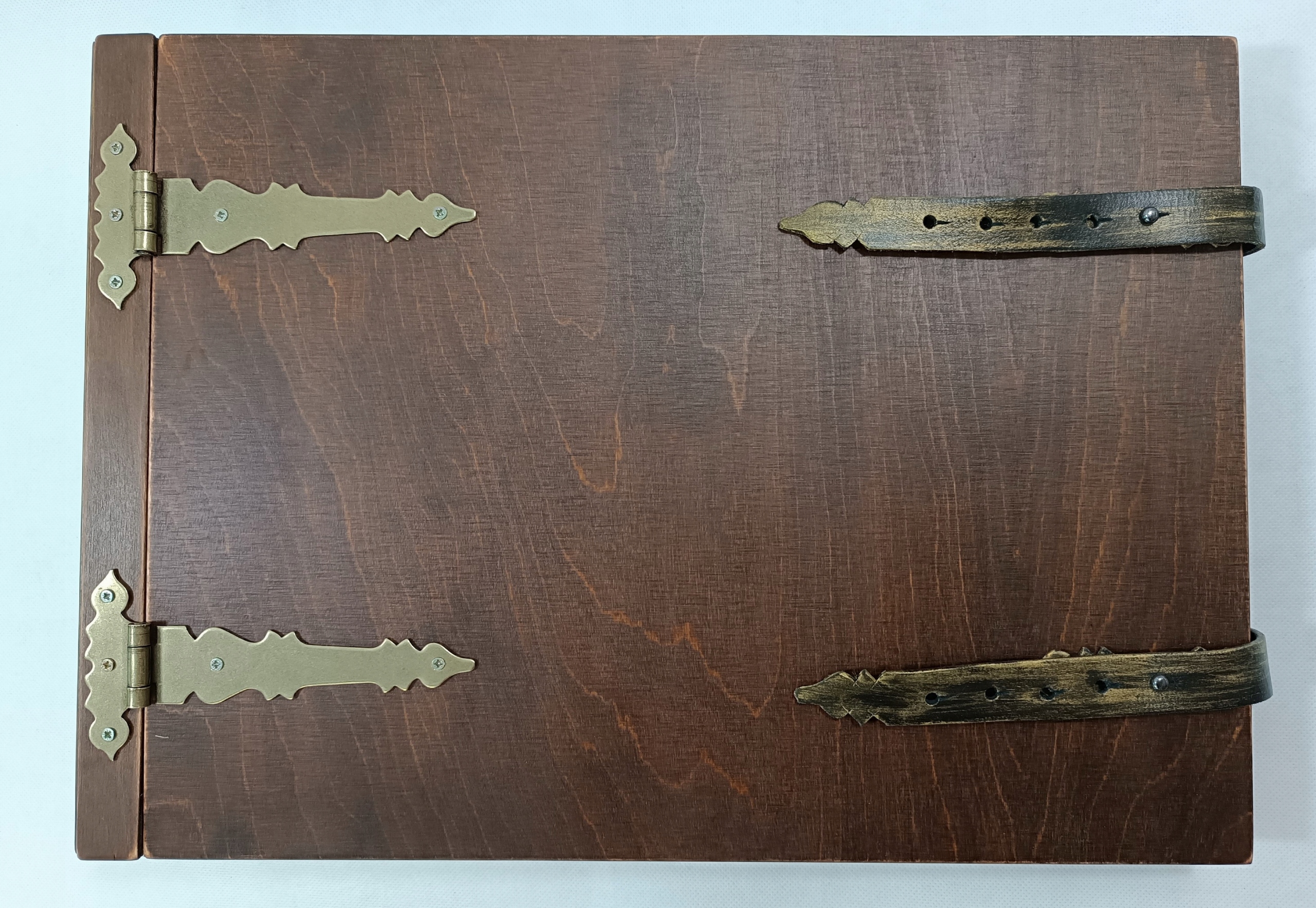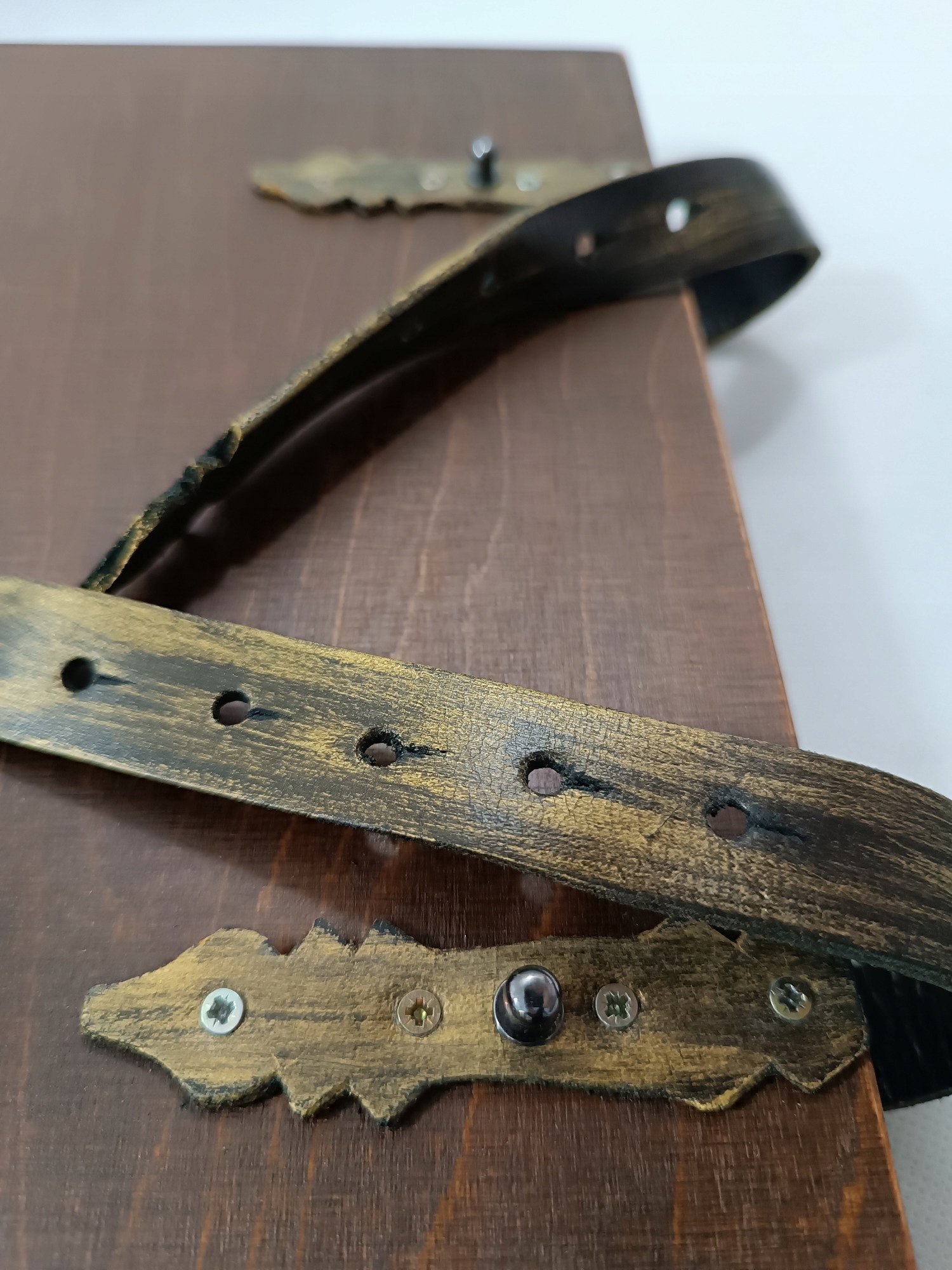 ОБКЛАДКА : фанера 0,6 товщина см, колір горіх, петлі металеві, шкіряні ремені чорного та золотого кольору