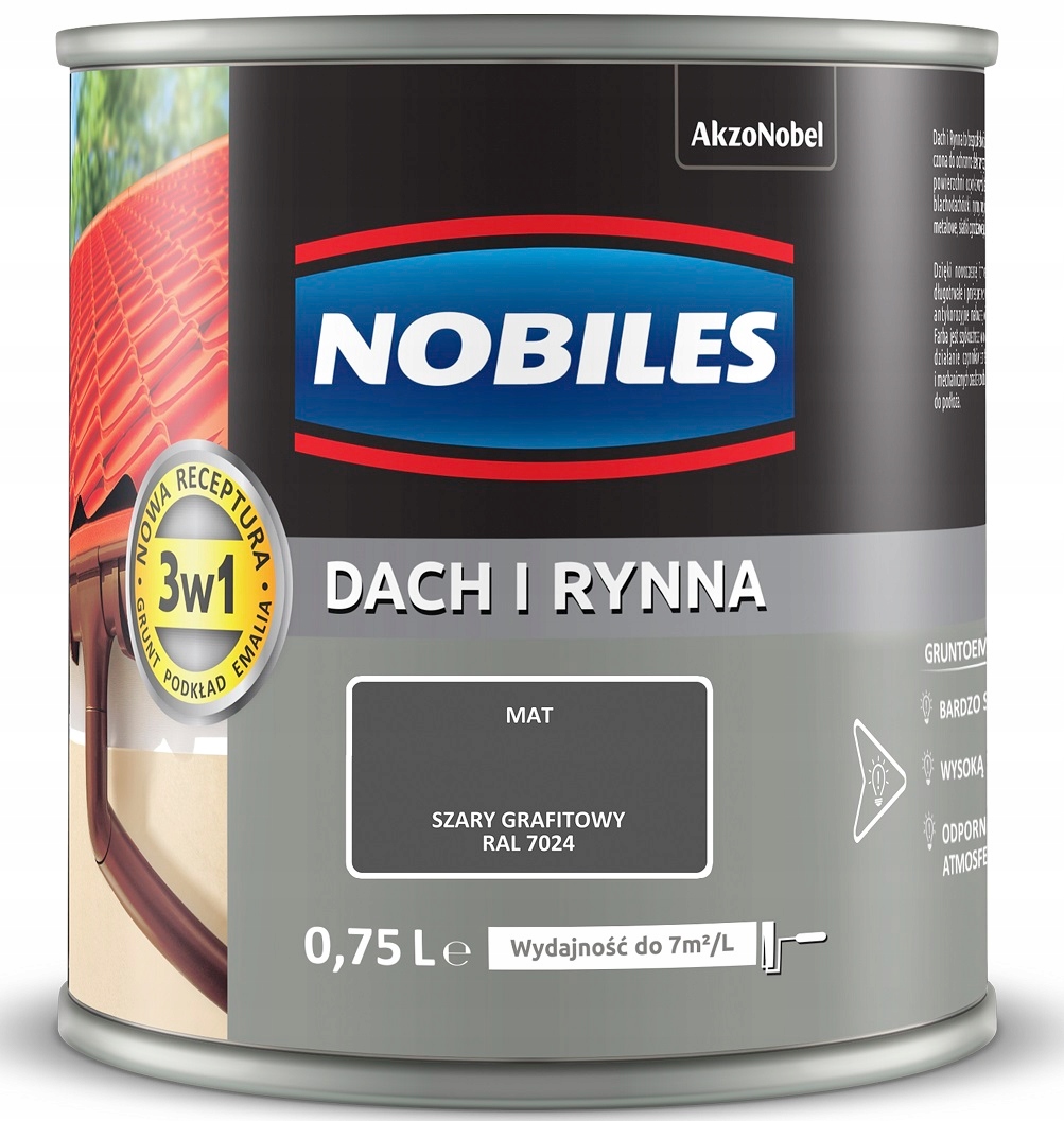 Nobiles Roof and Gutter – безґрунтовна фарба з матовим покриттям, призначена для захисно-декоративного фарбування оцинкованих поверхонь, таких як металочерепиця, водостоки, труби, металоконструкції, сітки для огорож тощо..