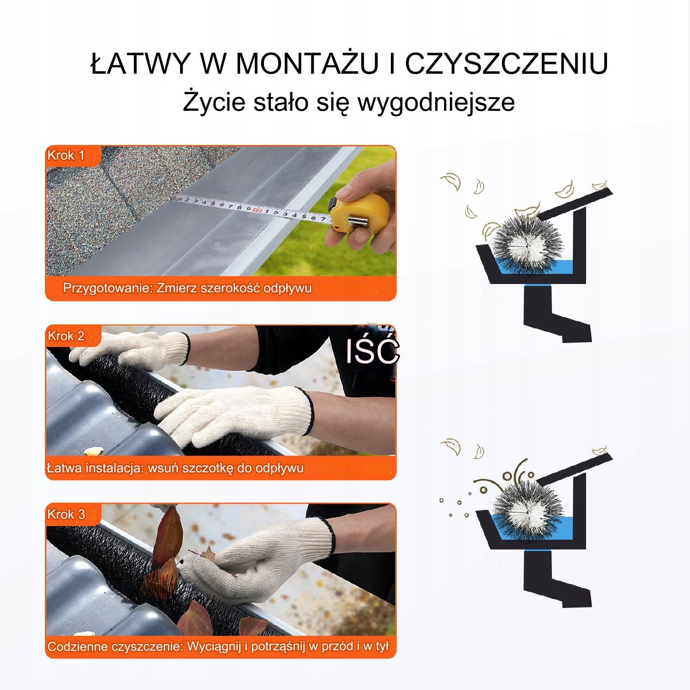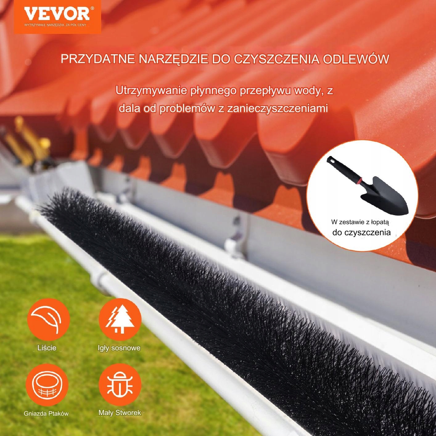 очищувач жолобів підходить до більшості стандартних жолобів і легко доходить до місць -доріжок та забезпечення ретельного очищення заощаджує час та зусилля. Крім того, очищення труб допомагає зменшити ризик замерзання льоду та снігу взимку, що може призвести до заторів. Це також ефективний захист жолобів проти птахів!