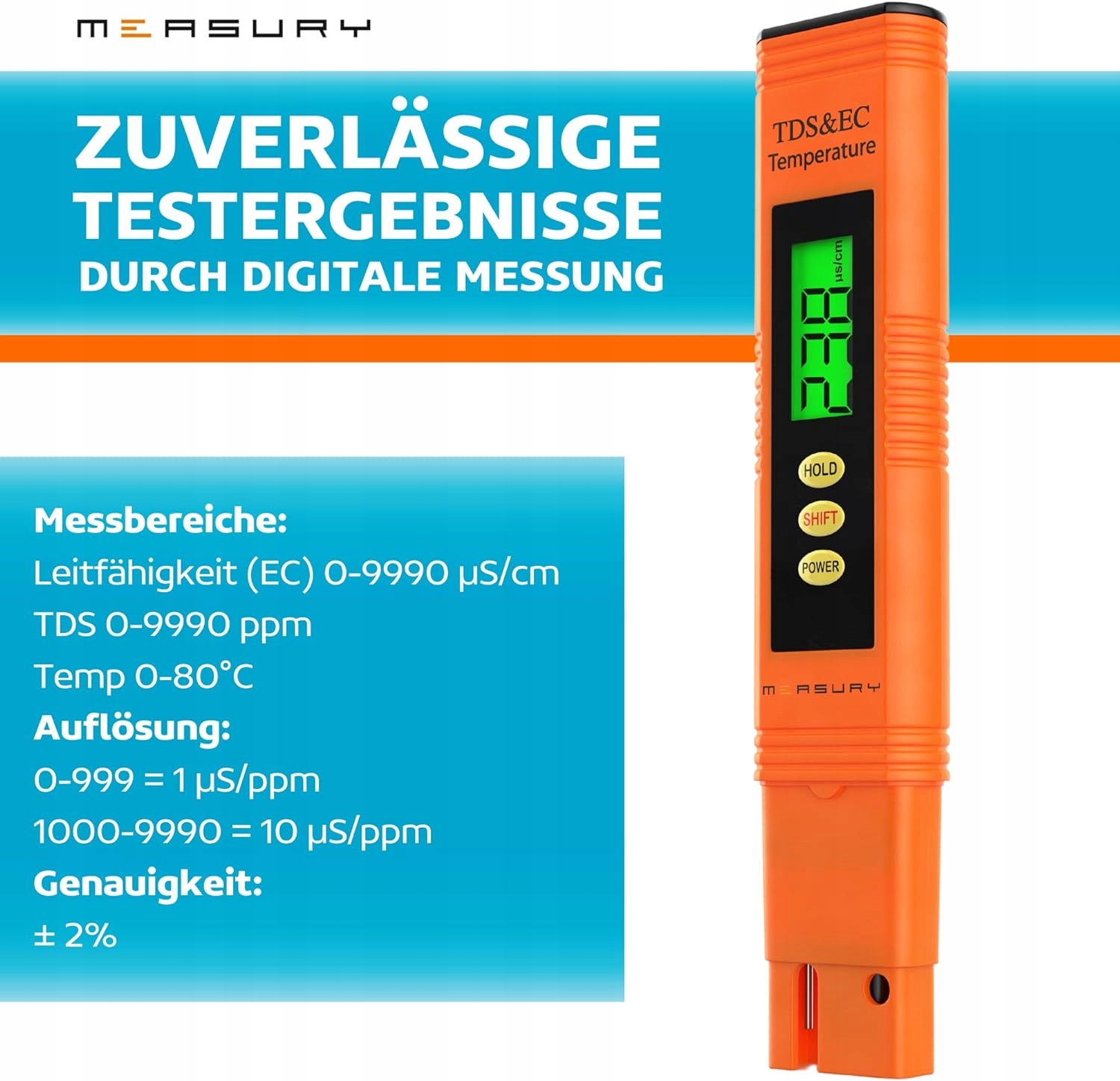 - Точні вимірювання: вимірювач MEASURY TDS&EC вимірює електропровідність (EC) у діапазоні 0–9990 мкс/см і значення TDS. в діапазоні 0 - 9990 ppm. Роздільна здатність: 1 мкс/ppm від 0 до 999, 10 мкс/ppm від 1000 до 9990. Точність вимірювального пристрою становить ± 2%.