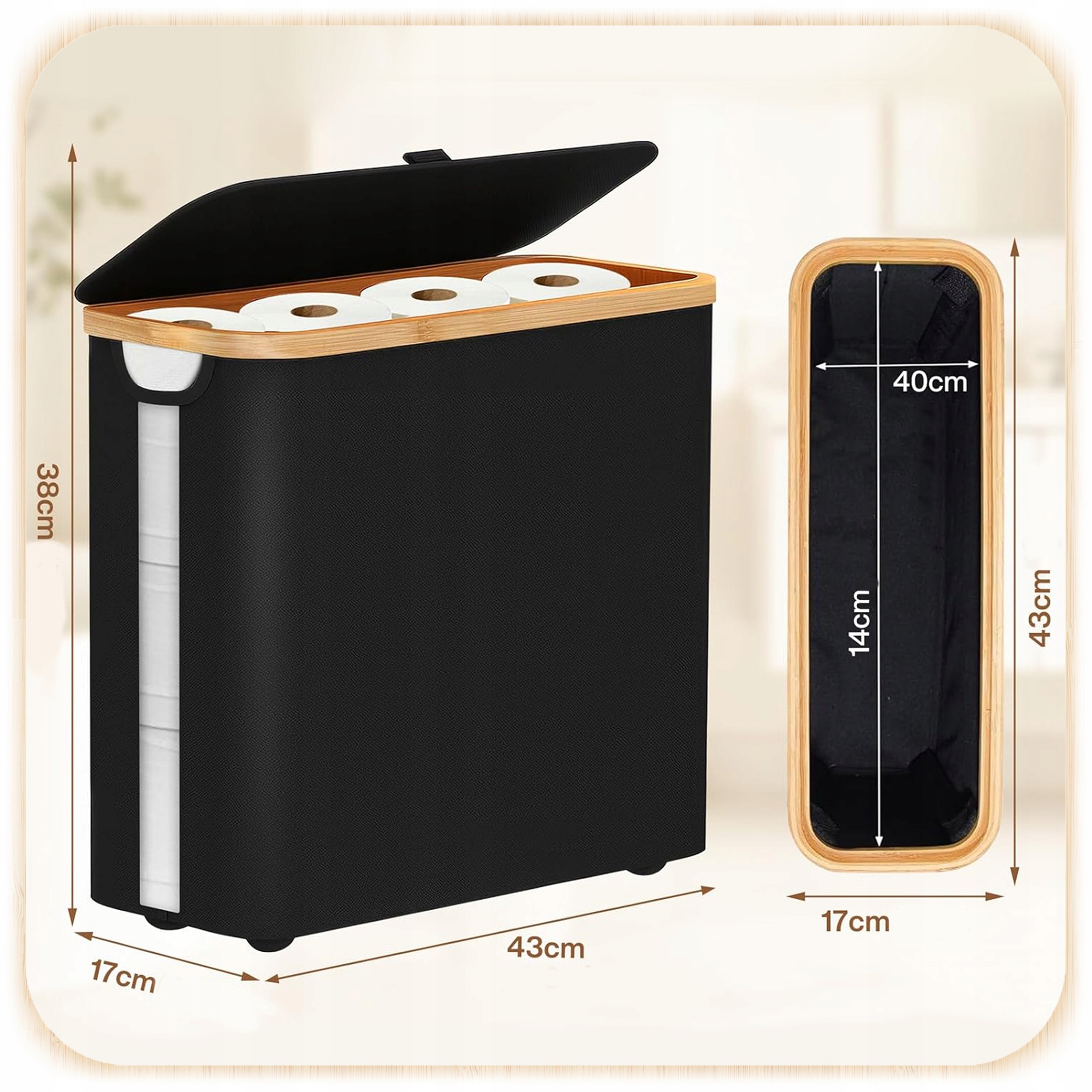 Подбайте про порядок та естетику у своїй ванній кімнаті завдяки стильному бамбуковому пакету для туалетного паперу. Це практичний, елегантний і повністю функціональний органайзер, який дозволяє зберігати папір гігієнічно та непомітно. Виготовлений із міцної оксфордської тканини та посилений бамбуковою рамою, він ідеально поєднує мінімалістичний вигляд із комфортом використання.
