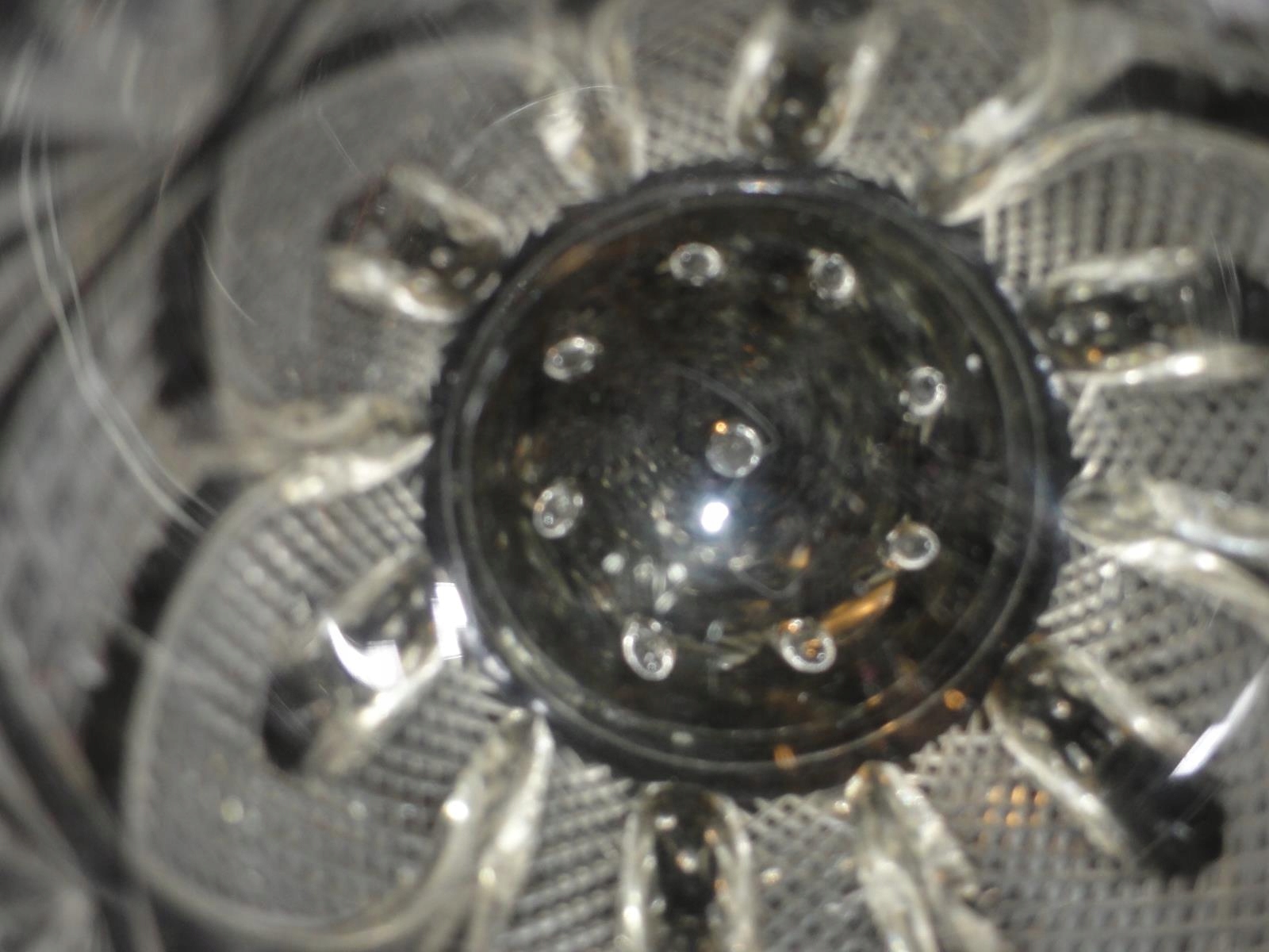 *чаша з безбарвного скла, видування форма, гомілка конічна з блискучим вирізом, чаша з 9 бульбашками повітря в основі, точно вирізана на черевці,
