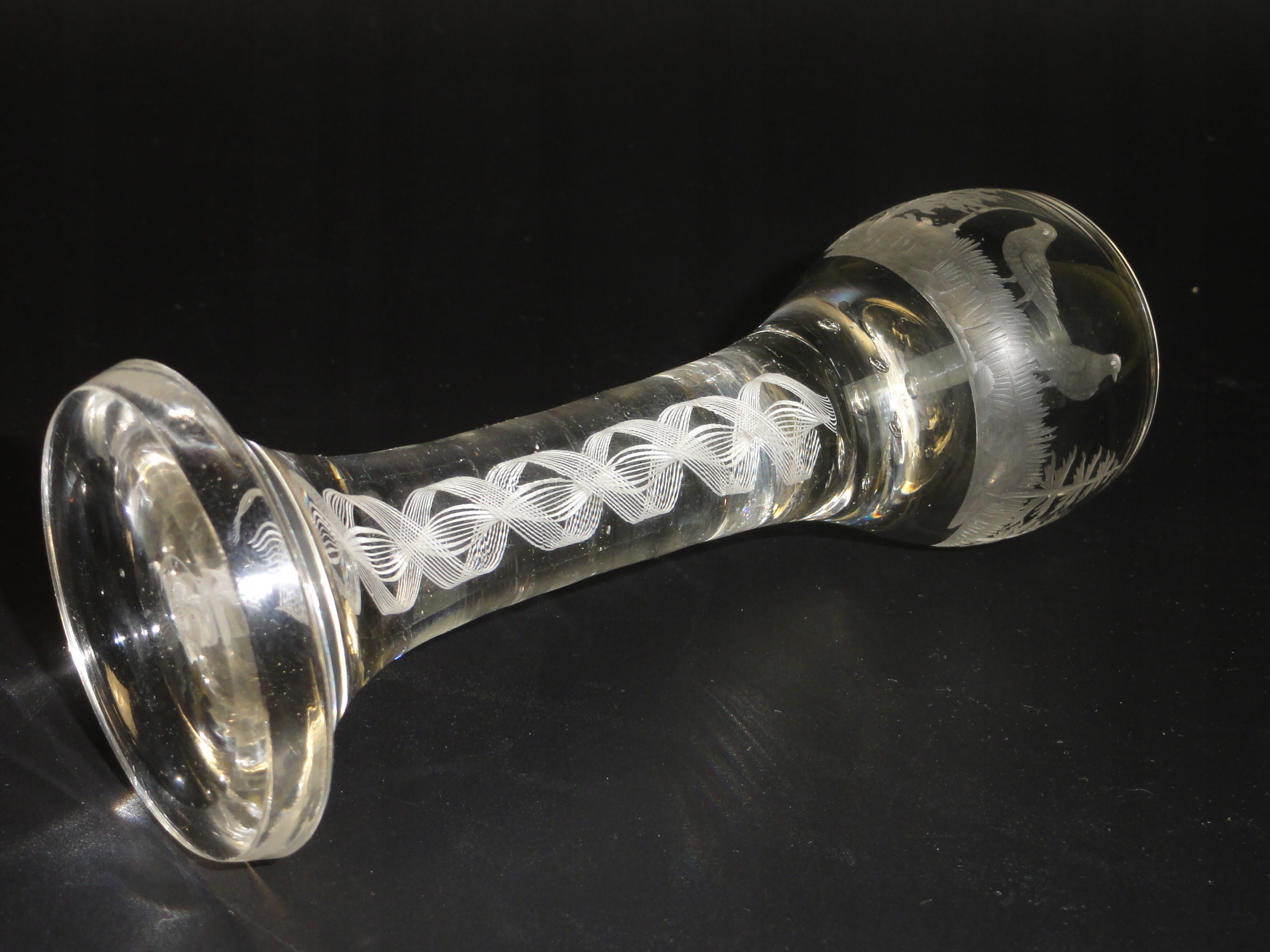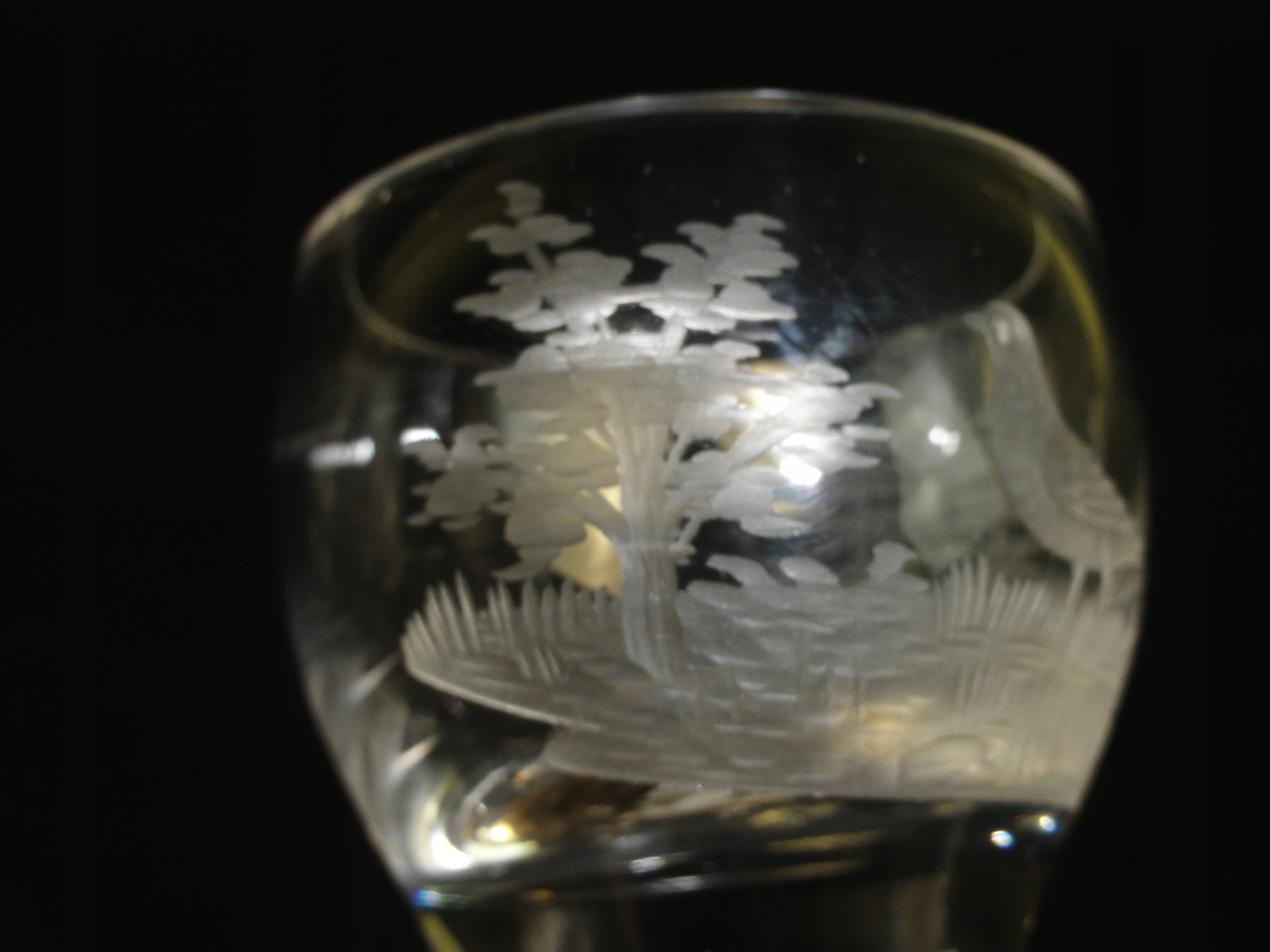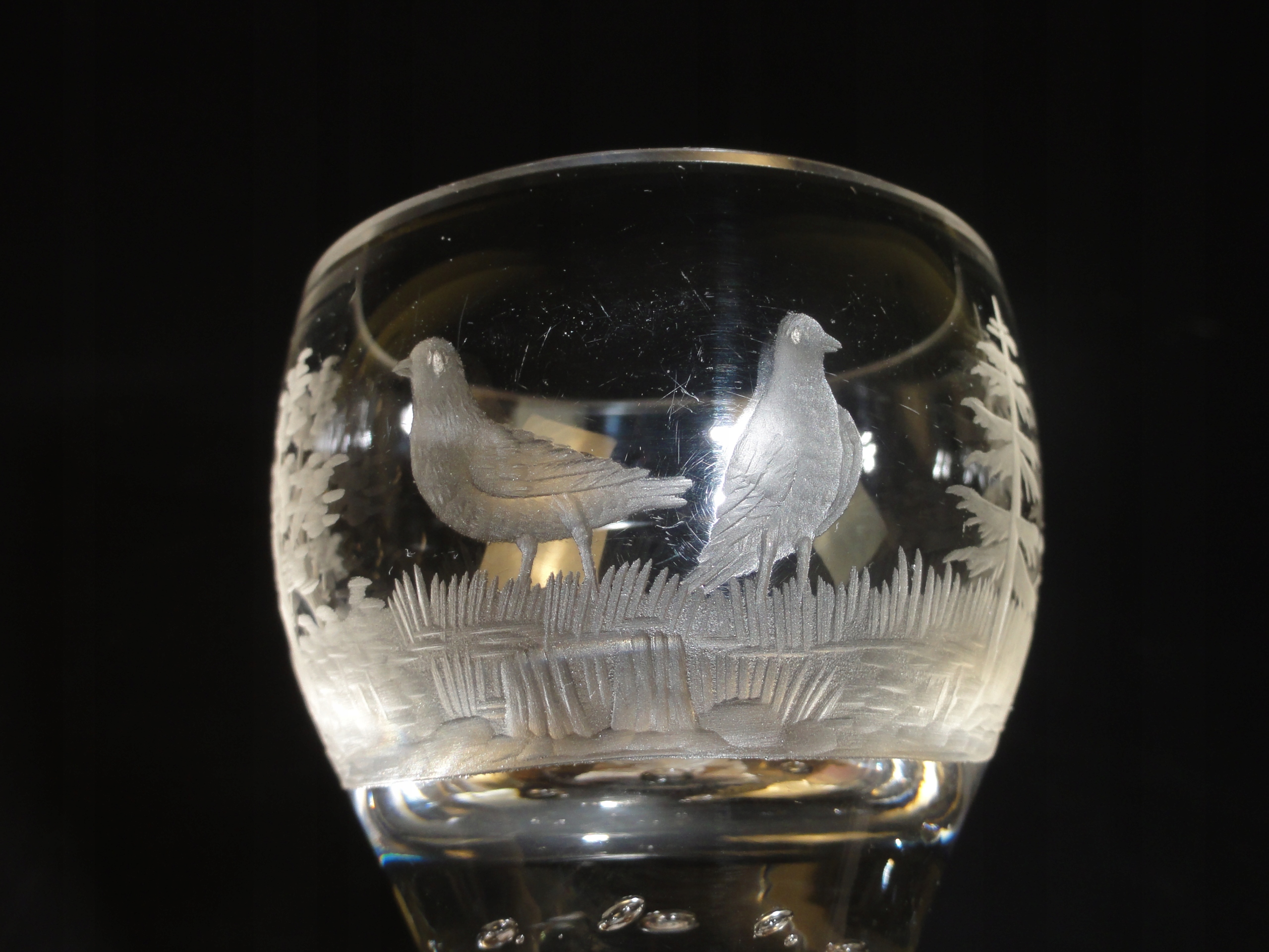 *чаша з безбарвного товстостінного скла, видувного у формі, з білим спіральним мереживом філігрань, гравірований мисливський мотив, сім бульбашок повітря в основі яйцеподібної чаші,