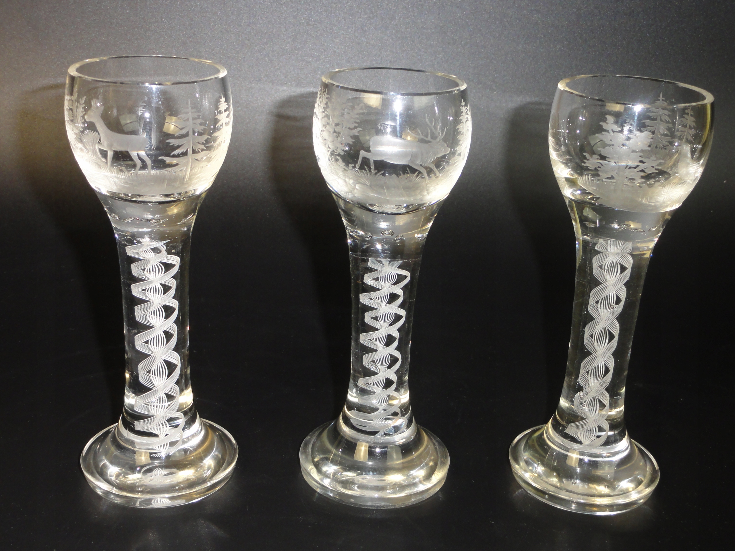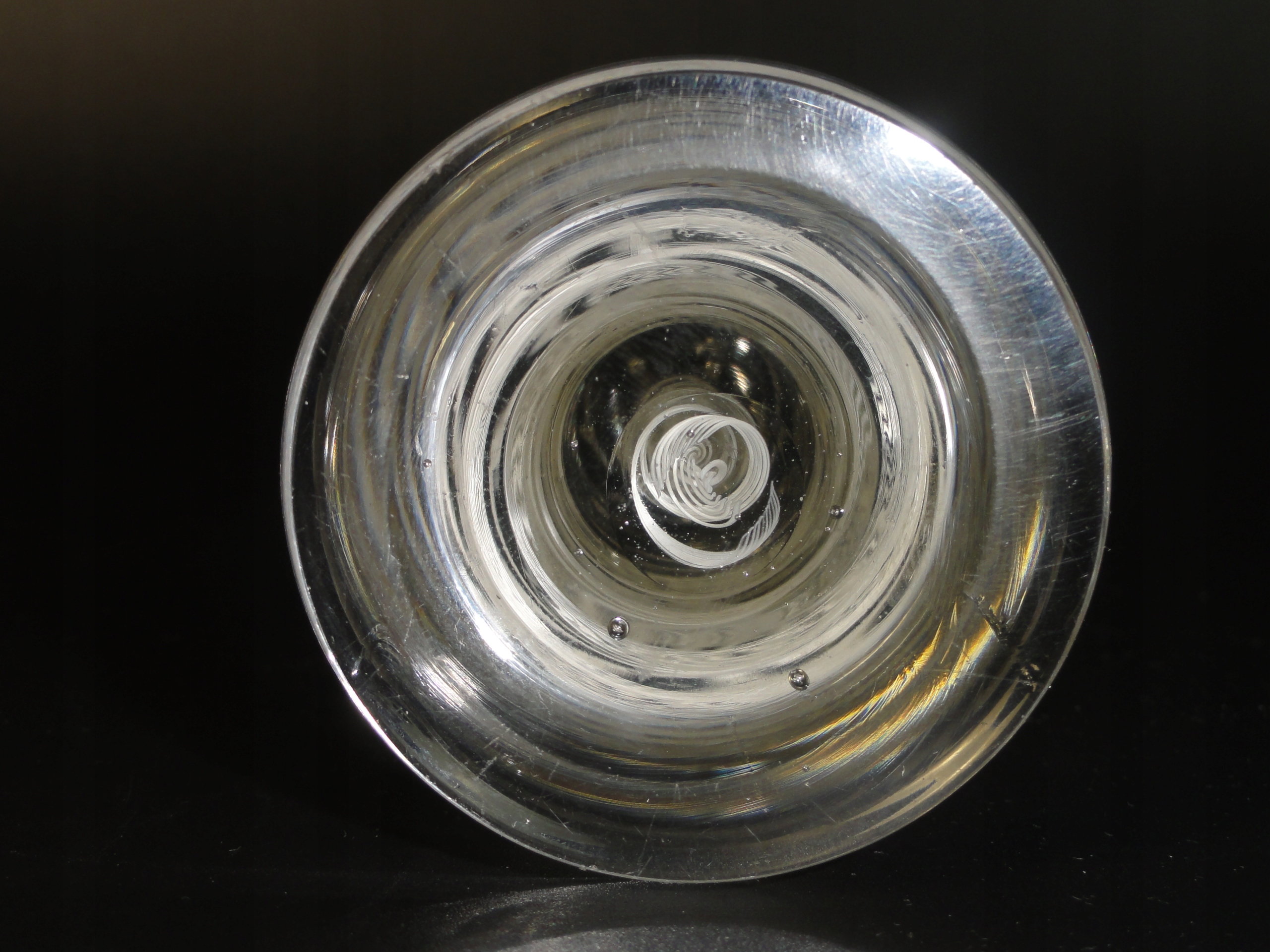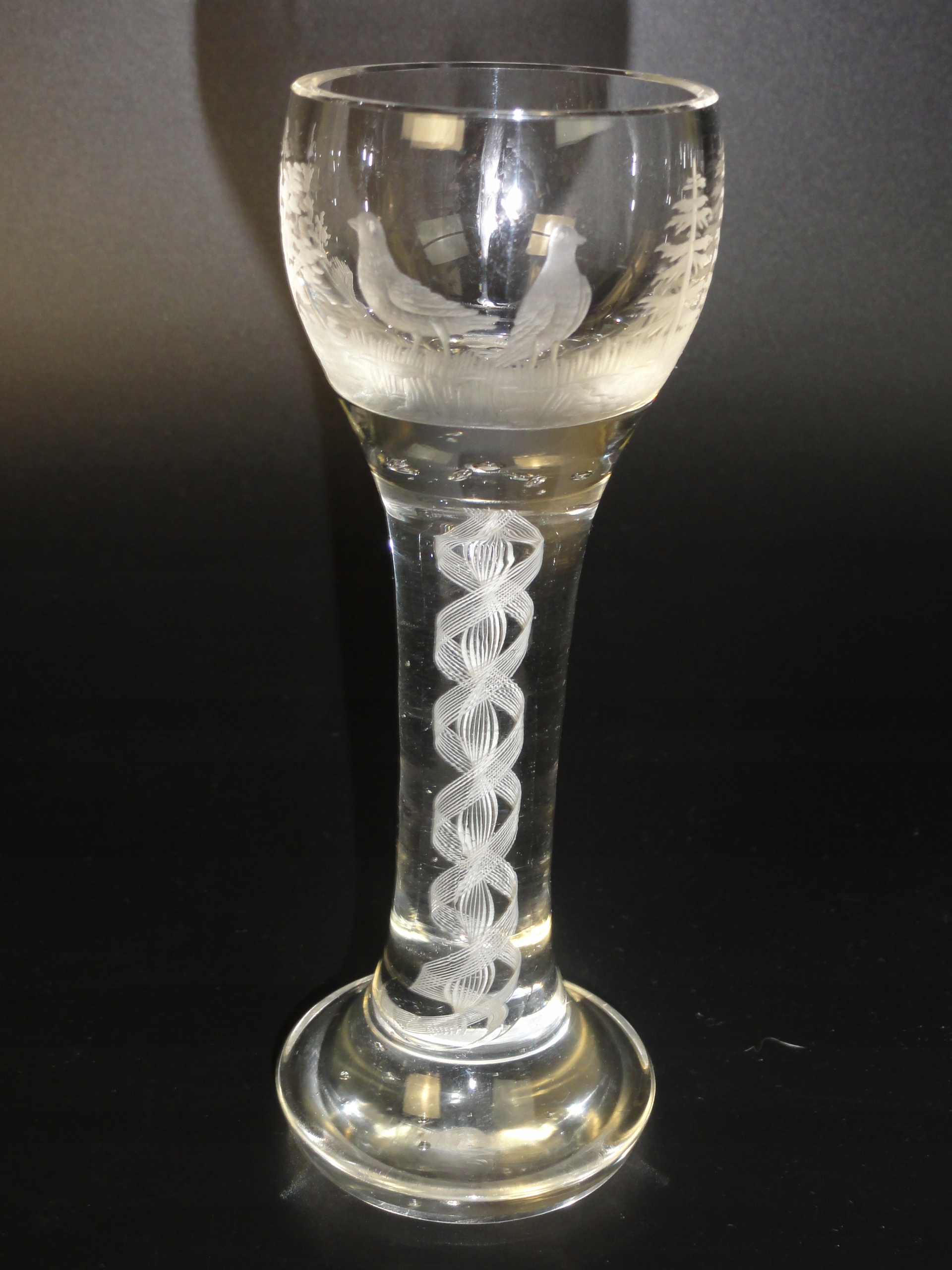 *чаша з безбарвного товстостінного скла, видувного у формі, з білим спіральним мереживом філігрань, гравірований мисливський мотив, сім бульбашок повітря в основі яйцеподібної чаші,