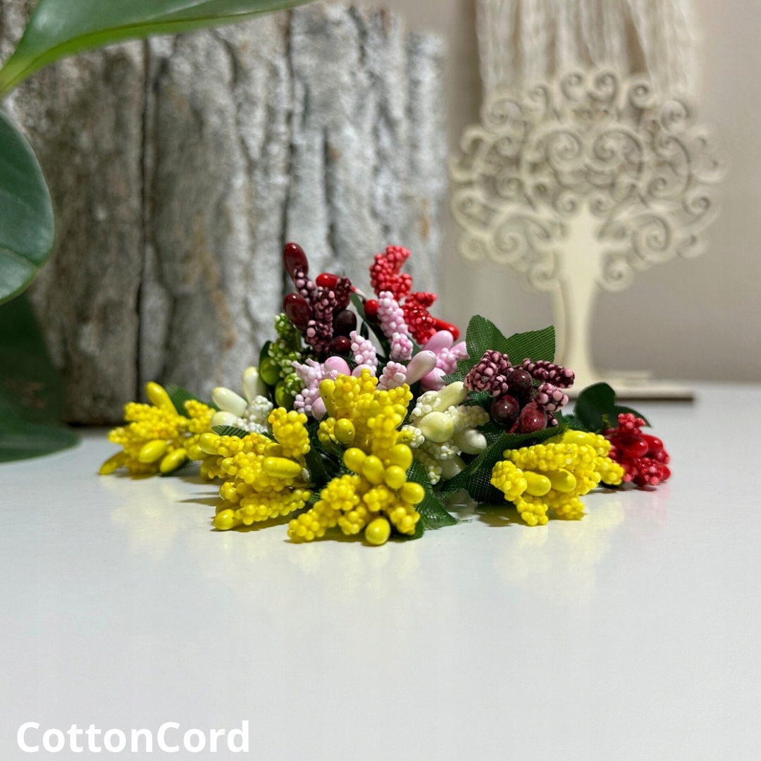 Красиві делікатні барвисті квіти - це чудове доповнення до ляльок Макрам. На одному проводі є невеликий пучок, що складається з стрижнів, ягід і листя. Їх також можна використовувати як тичинки для виготовлення пініранських квітів. Це винятково прикрасить квіткові вінки для волосся, фасціончі та смуги. 9 см