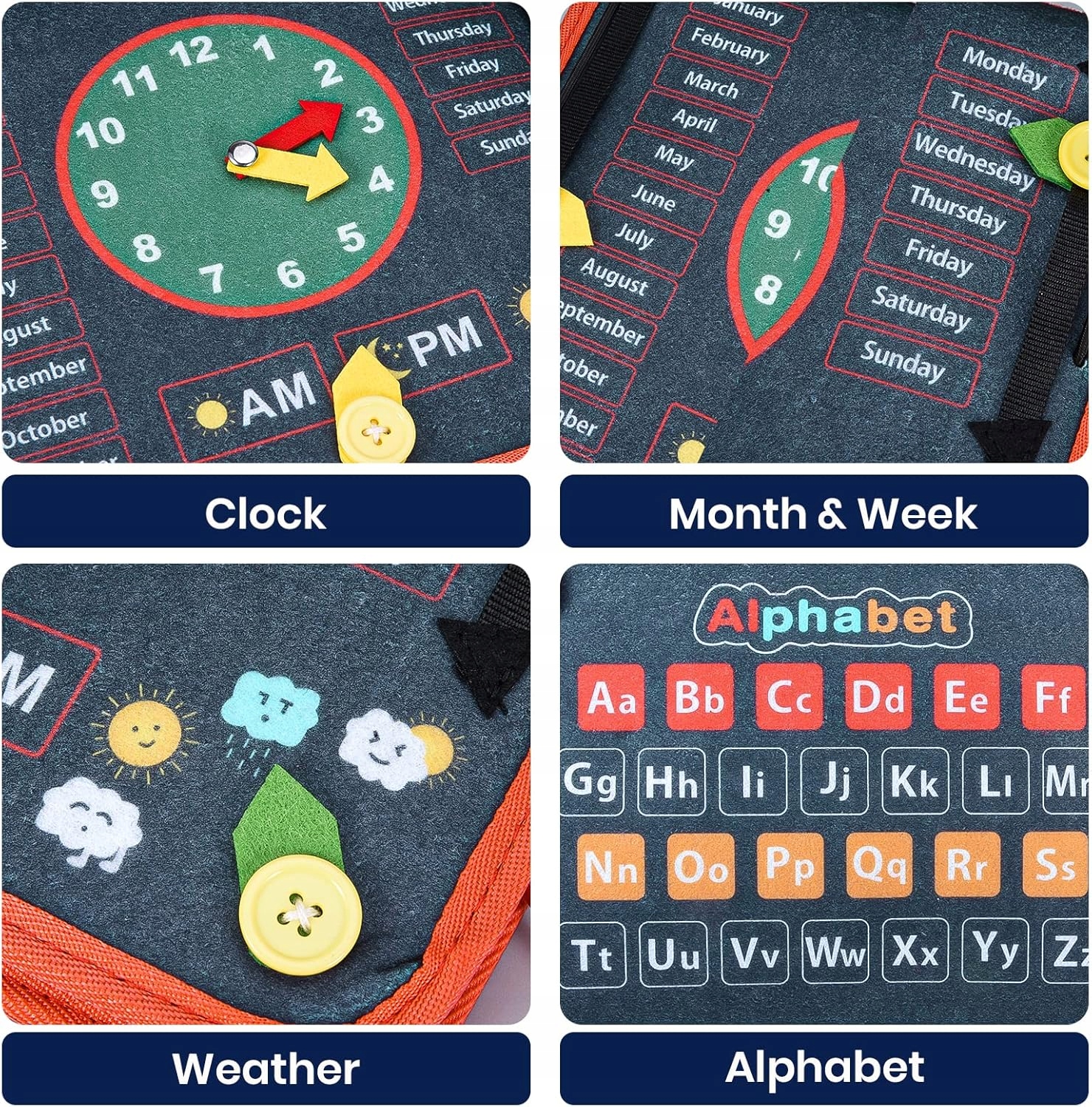 - [Багатофункціональна] дошка для занять із різнокольоровими пряжками, кишенями на застібках, шнурівками та ґудзиками тощо, щоб імітувати виклики реального світу, щоб діти могли навчатися та практикувати важливі навички одягання у власному темпі, розважаючись. Тильна сторона туалетної дошки може допомогти дітям вивчити годинник, місяць і тиждень, погоду та алфавіт.
