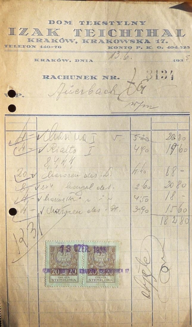 Рахунок на фірмовому бланку - Dom Tekstylny Izak Teichtal, Kraków, Krakowska 17. За 6 видів товарів було сплачено загальну суму 182,80 злотих. Від 13.06.1935. Текст односторонній, формат 14х23 см, гарний стан [три дірки на лівому полі] 799