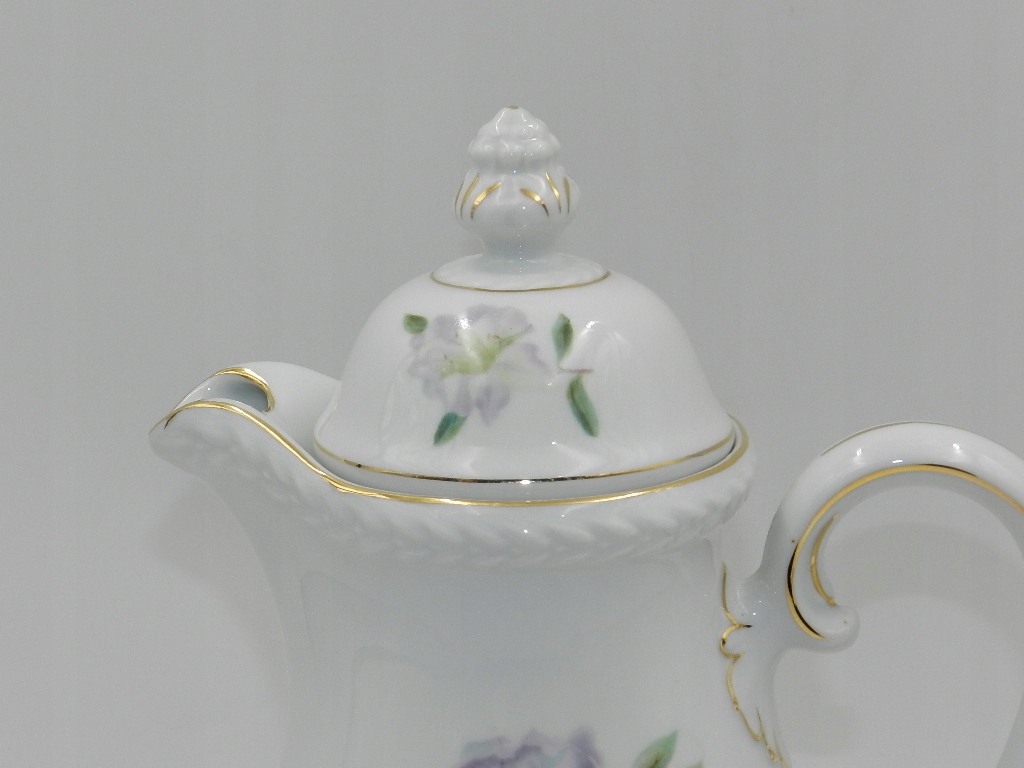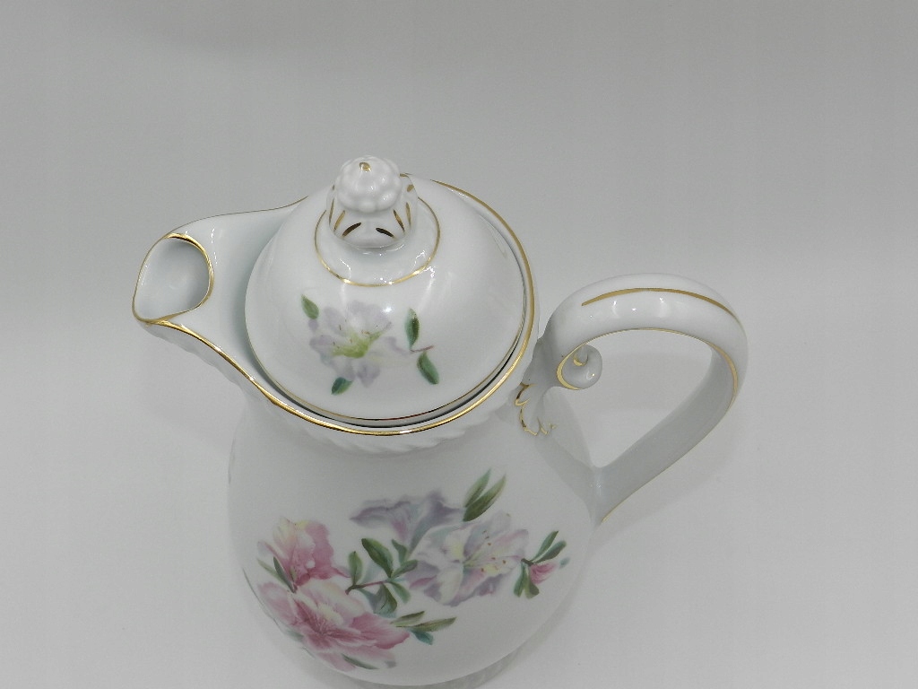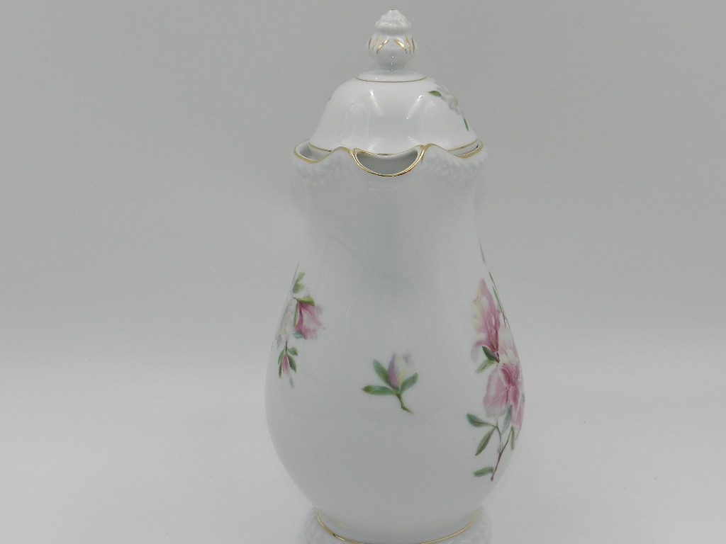 Біла порцеляна надзвичайно гармонійної форми з чудовим мотивом гілки фіолетових і рожевих квітів як спереду, так і ззаду глечика. Крім того, на обкладинці повторюється квітковий мотив. Все оздоблено тонкою золотою позолотою. Все це доповнюється чудово сформованою вершиною та товстим рельєфом навколо литника та на основі.