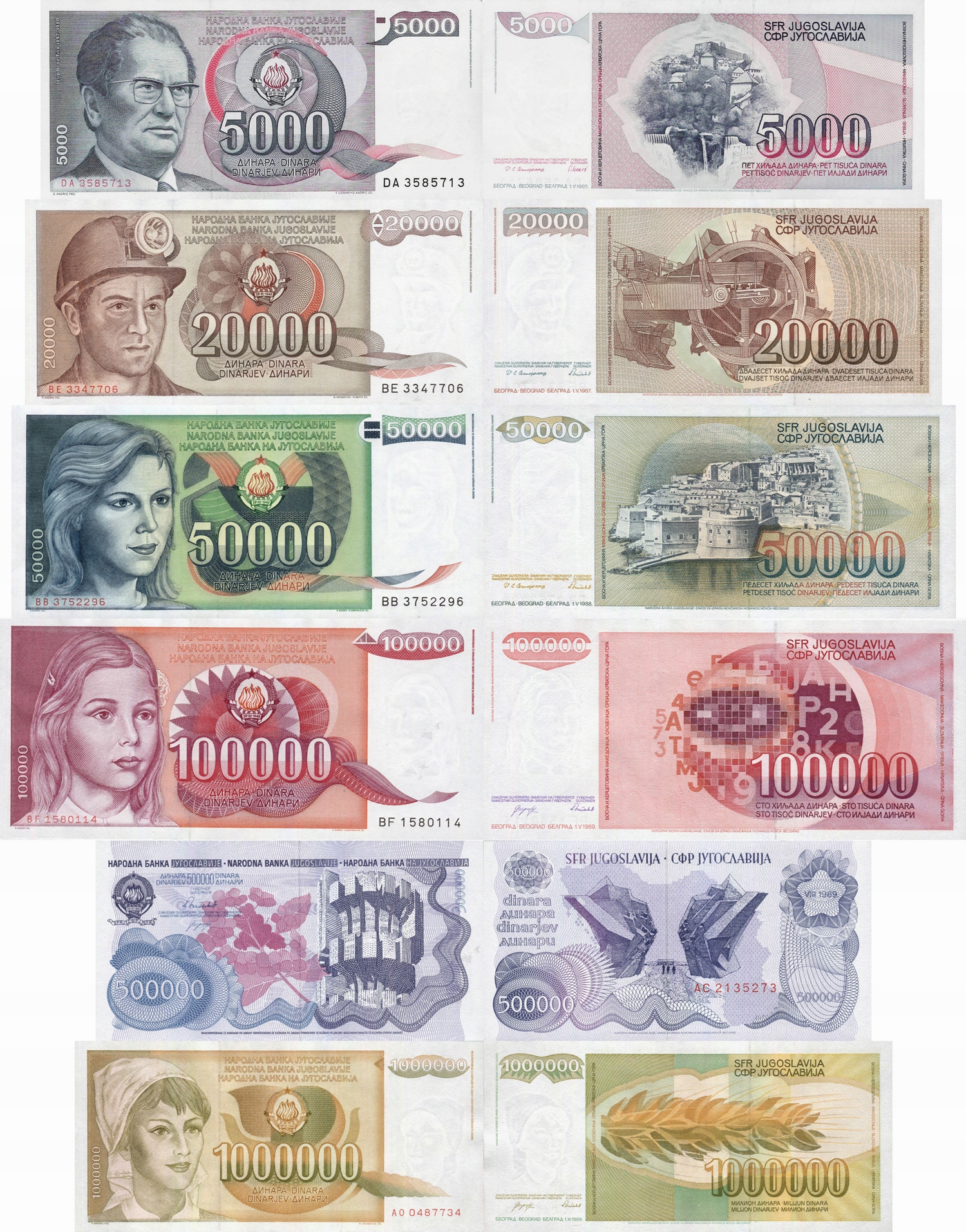 Jugosławia zestaw 5000+20000+50000+ 100000+500000+1000000 Dinars P93-99 UNC