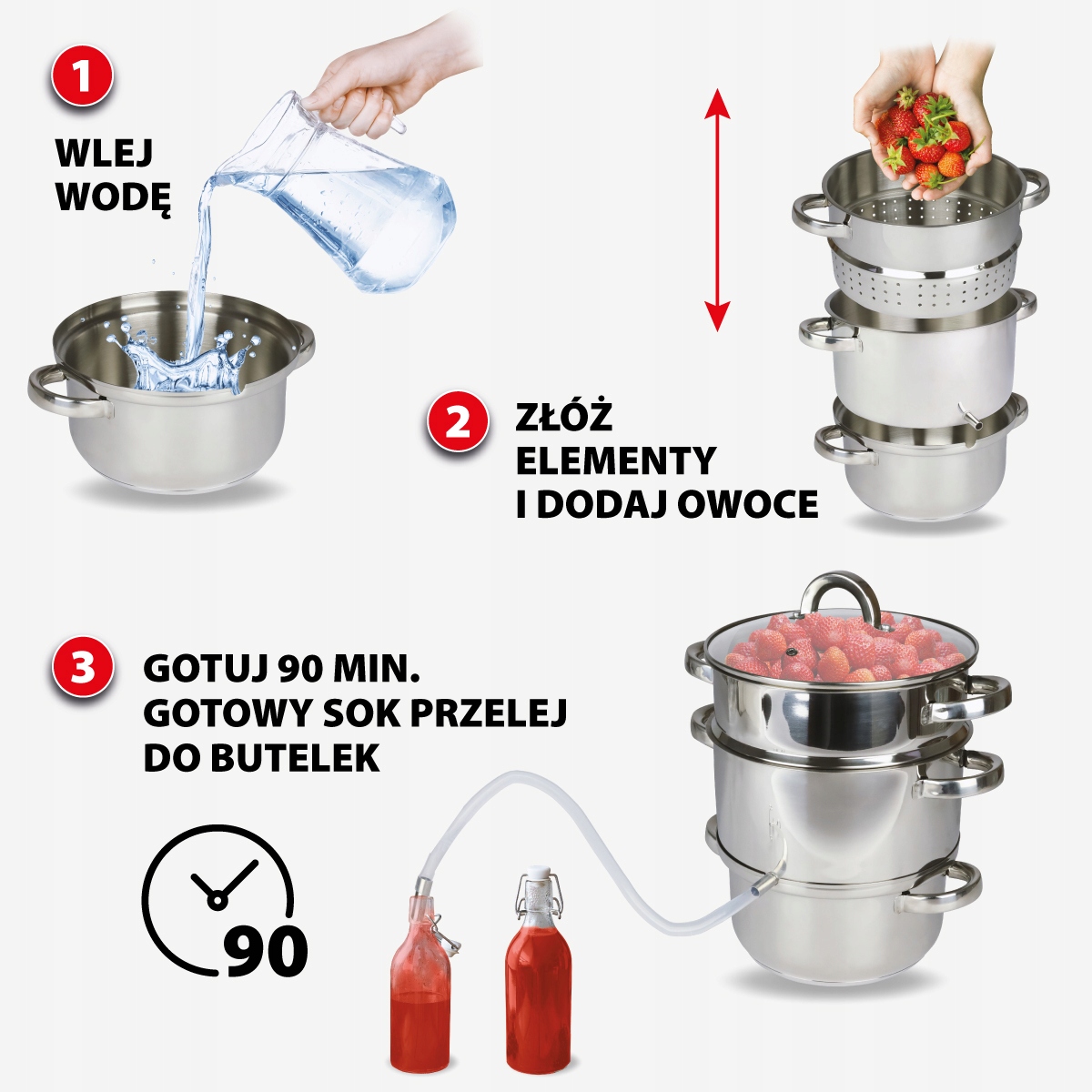 В результаті нагрівання вода, налита в нижню каструлю, починає випаровуватися, рухаючись на наступні рівні, і фрукт випустить сік через кілька хвилин. Це абсолютно природний процес - для отримання смачних соків не потрібно додавати жодних штучних речовин. Найкраще для цього підійдуть стигла малина, яблука, полуниця, чорноплідна горобина, груші, агрус, смородина, бузина, шипшина або чорниця.