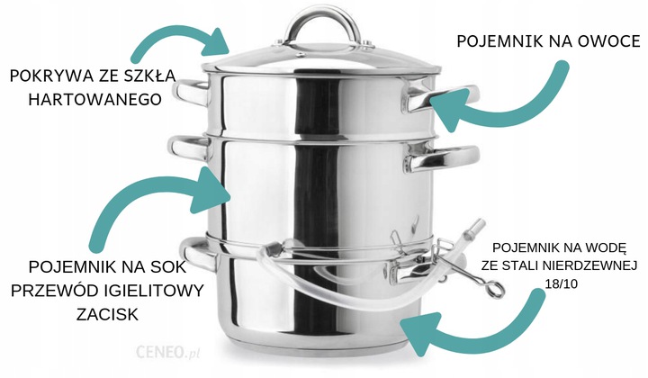 Всі елементи виготовлені з високоякісної нержавіючої сталі, головна перевага якої відрізняється високою довговічністю і міцністю, стійкістю до корозії, температурних деформацій і механічних пошкоджень. Товсті стінки і багатошарове дно дозволяють дуже швидко нагріватися посудині і підтримувати постійну температуру всередині. Завдяки цьому процес приготування соку відбувається набагато швидше, ніж у стандартних соковижималках. Використовуючи цей продукт, ви можете бути впевнені, що приготування соку завжди буде успішним і ви не втратите жодної кількості їжі.