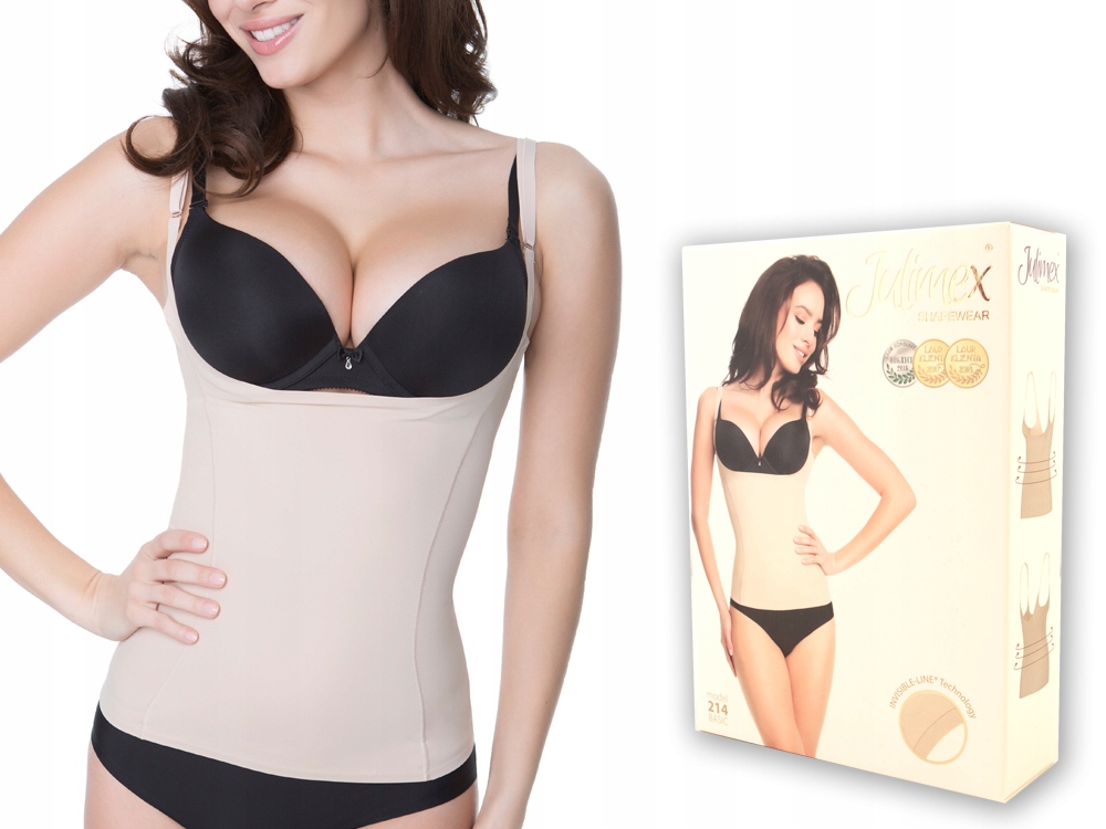 Julimex 214 - це футболка для схуднення під бюст, яка дозволяє формувати верхню частину фігури, одягаючи улюблений бюстгальтер. Футболка виготовлена за сучасною технологією Julimex Invisible Line®. Має інноваційне кріплення лямок, яке запобігає їх випадковому розстібанню. Спеціальні гнучкі зони для схуднення розгладжують живіт, підкреслюють талію і формують стегна. Продумані силіконові смужки внизу запобігають задиранню футболки та підвищують комфорт під час носіння.