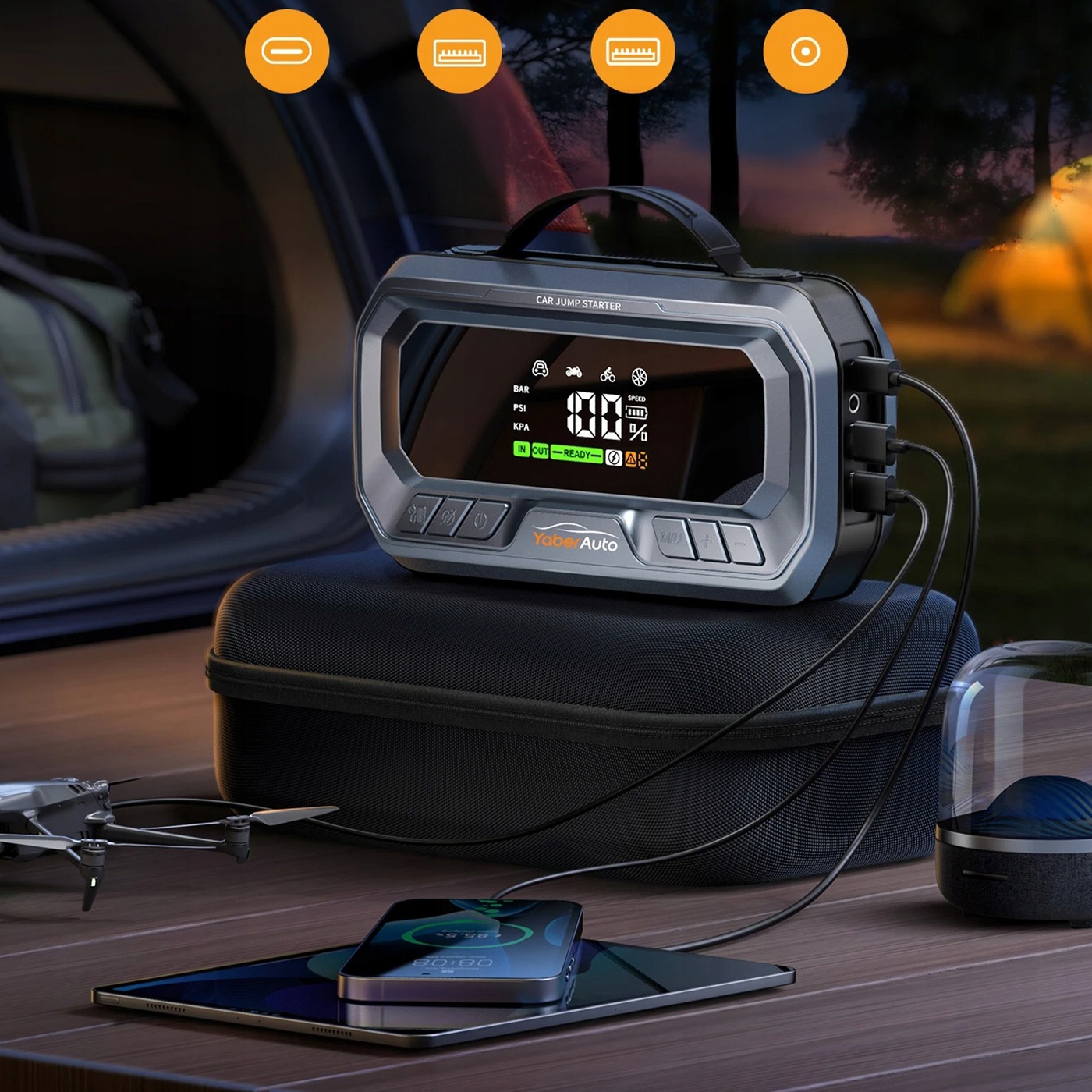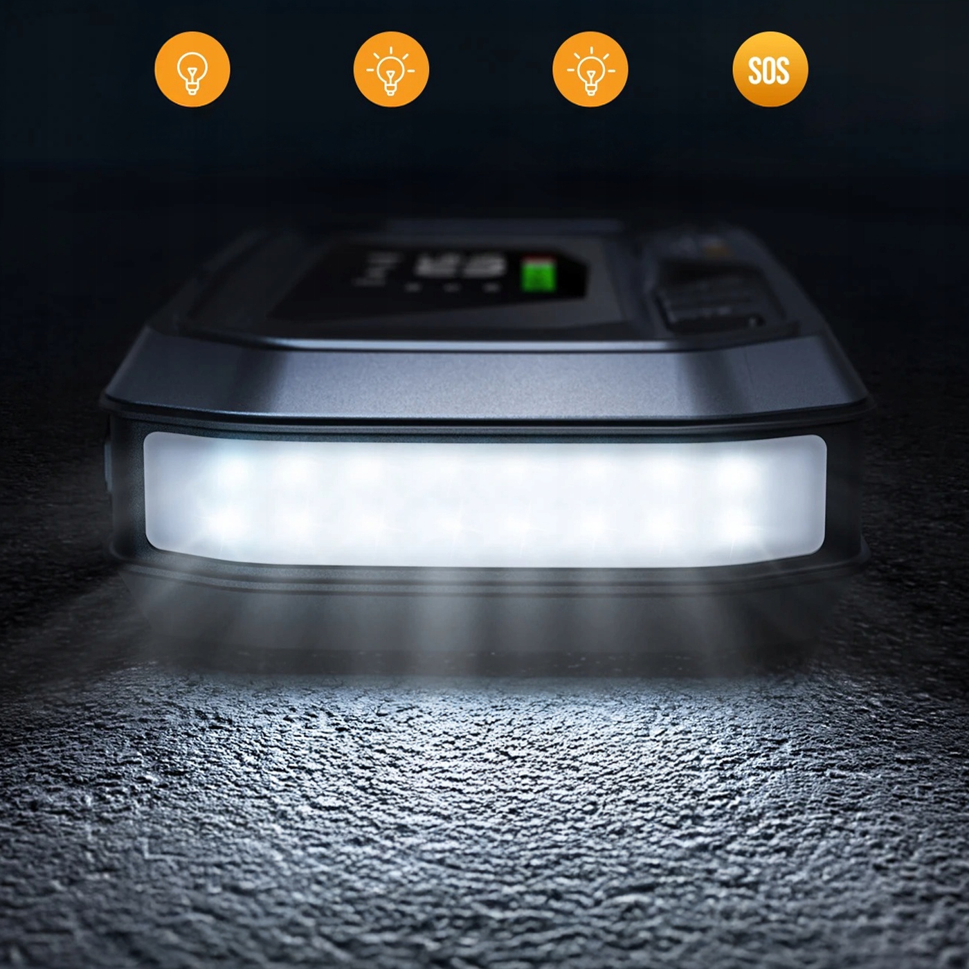 Більше не хвилюйтеся про розряджену батарею, спущені шини чи брак енергії для пристроїв! Цей комплексний пристрій 4-в-1 є важливим елементом обладнання кожного автомобіля. Його максимальний пусковий струм становить 6000A, що дозволяє запускати всі бензинові та дизельні двигуни до 12,0 літрів.