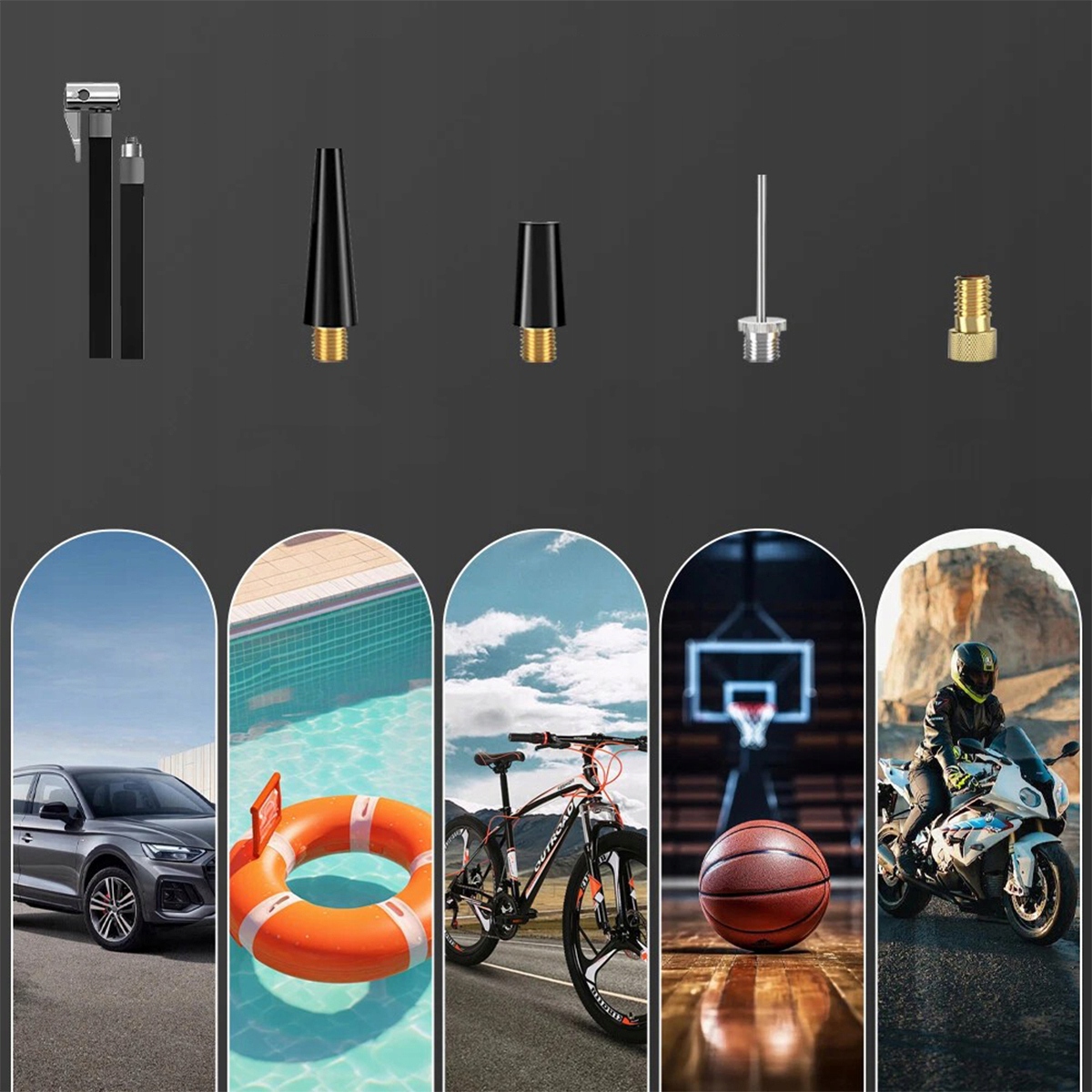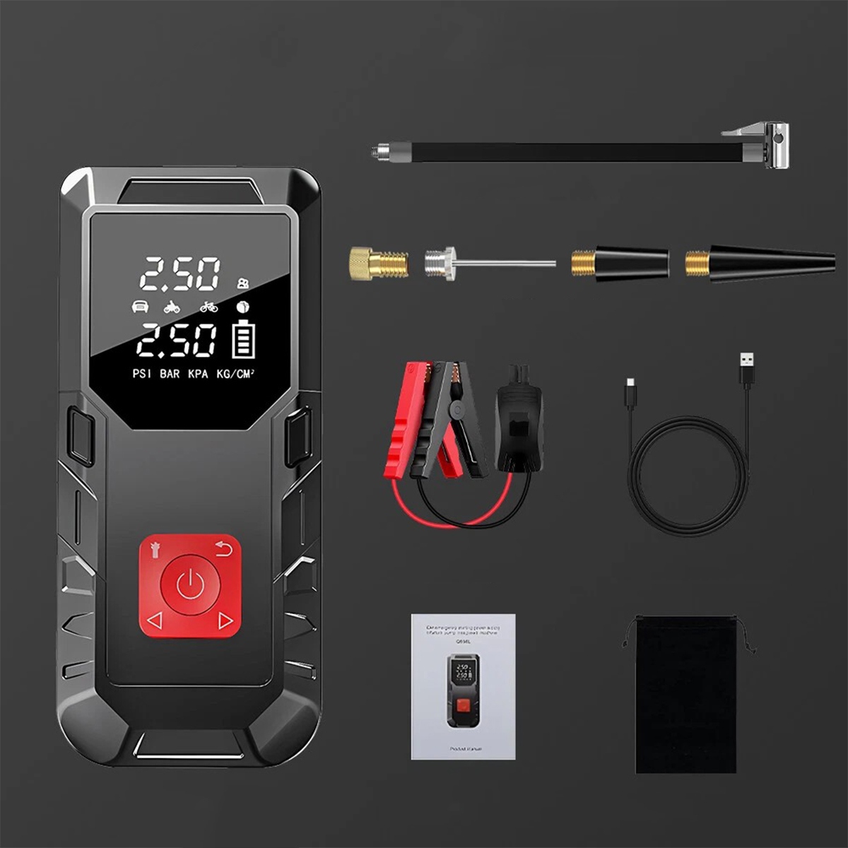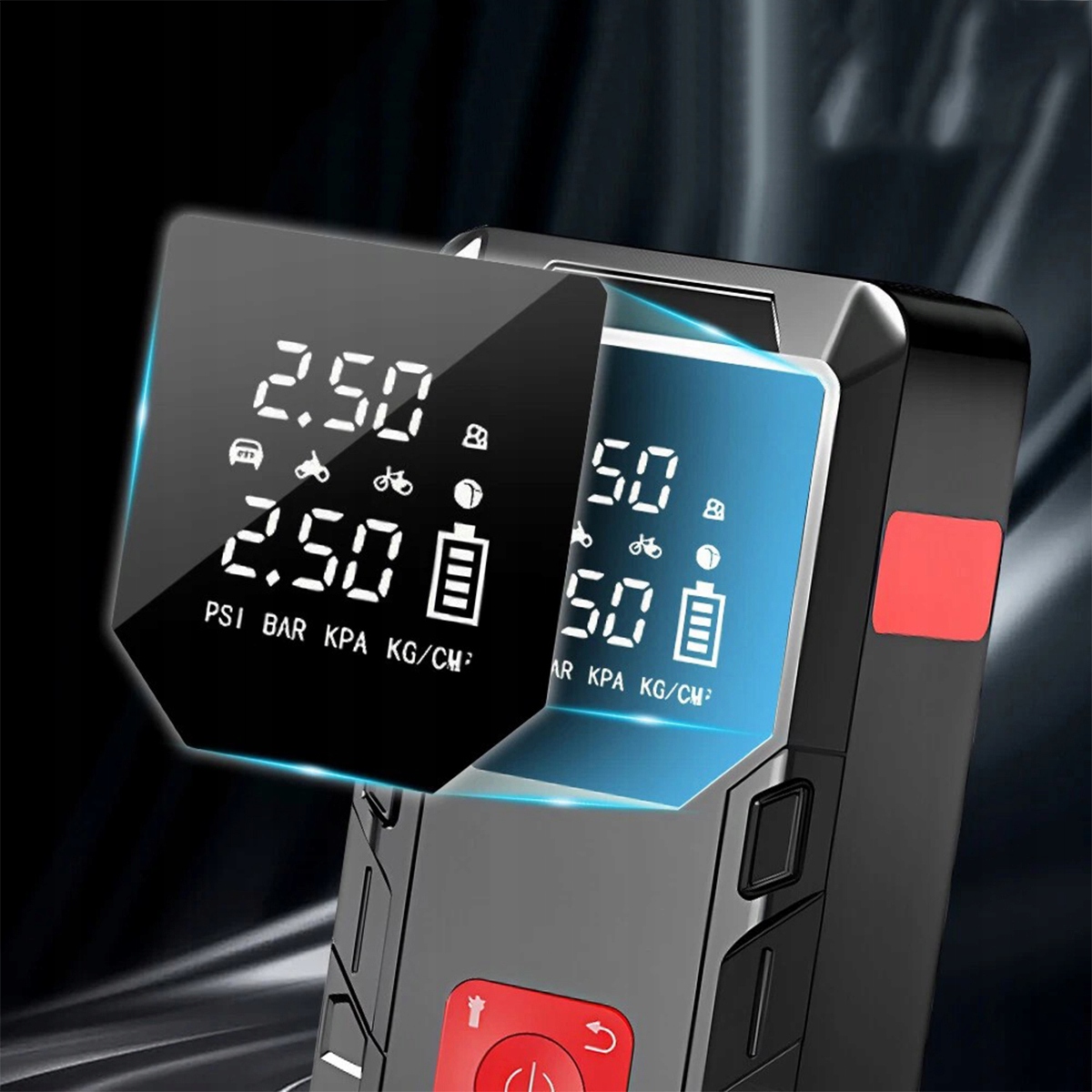 Пристрій також можна використовувати як повітряний насос. Він оснащений 4 різними наконечниками, 4 додатковими одиницями тиску: PSI, BAR, KPA, кг/см² і 4 попередньо визначеними режимами надування (велосипед, мотоцикл, автомобіль і м’яч). Його можна використовувати для накачування автомобілів, мотоциклів, велосипедів, плавальних кілець, байдарок і різних видів м’ячів.