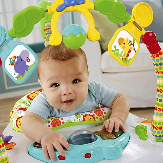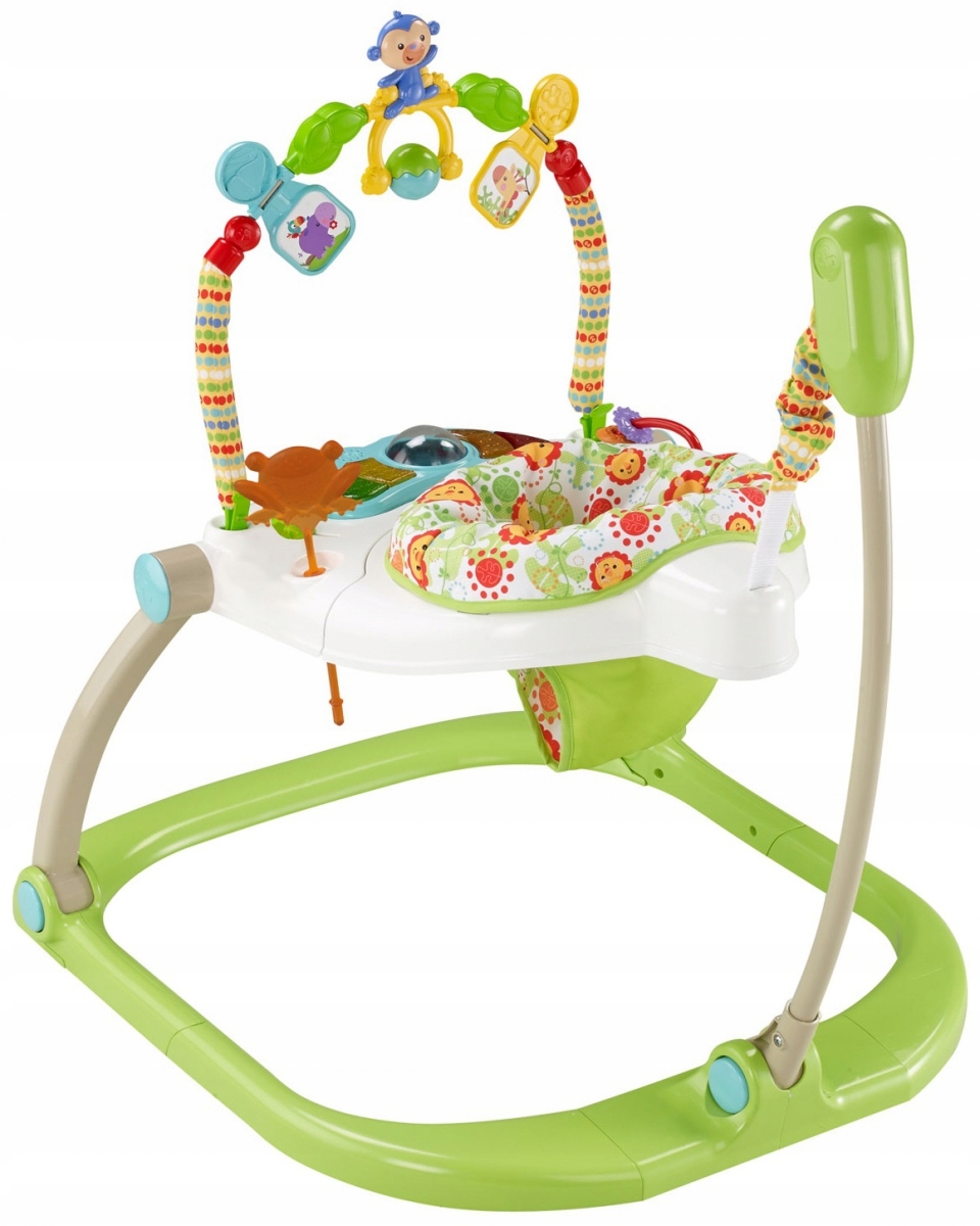 Стрибуна Fisher Price складається з піаніно з райдужними клавішами, прорізувачем для жаби, гусеницею, що клацає, мавпочкою з м’ячем, що обертається, палицею з кільцями, що цокають, і двома тропічними друзями, що обертаються.