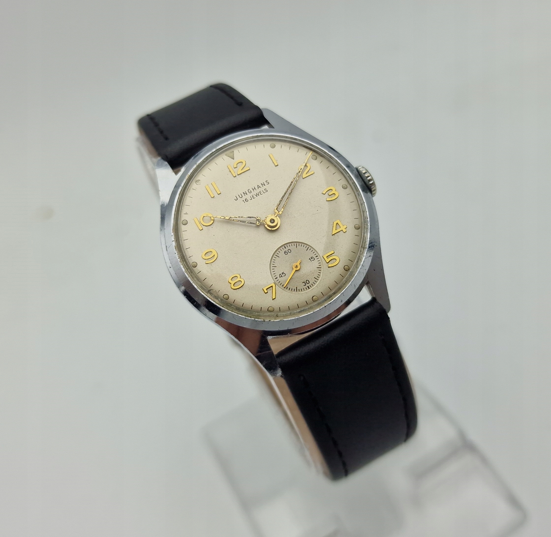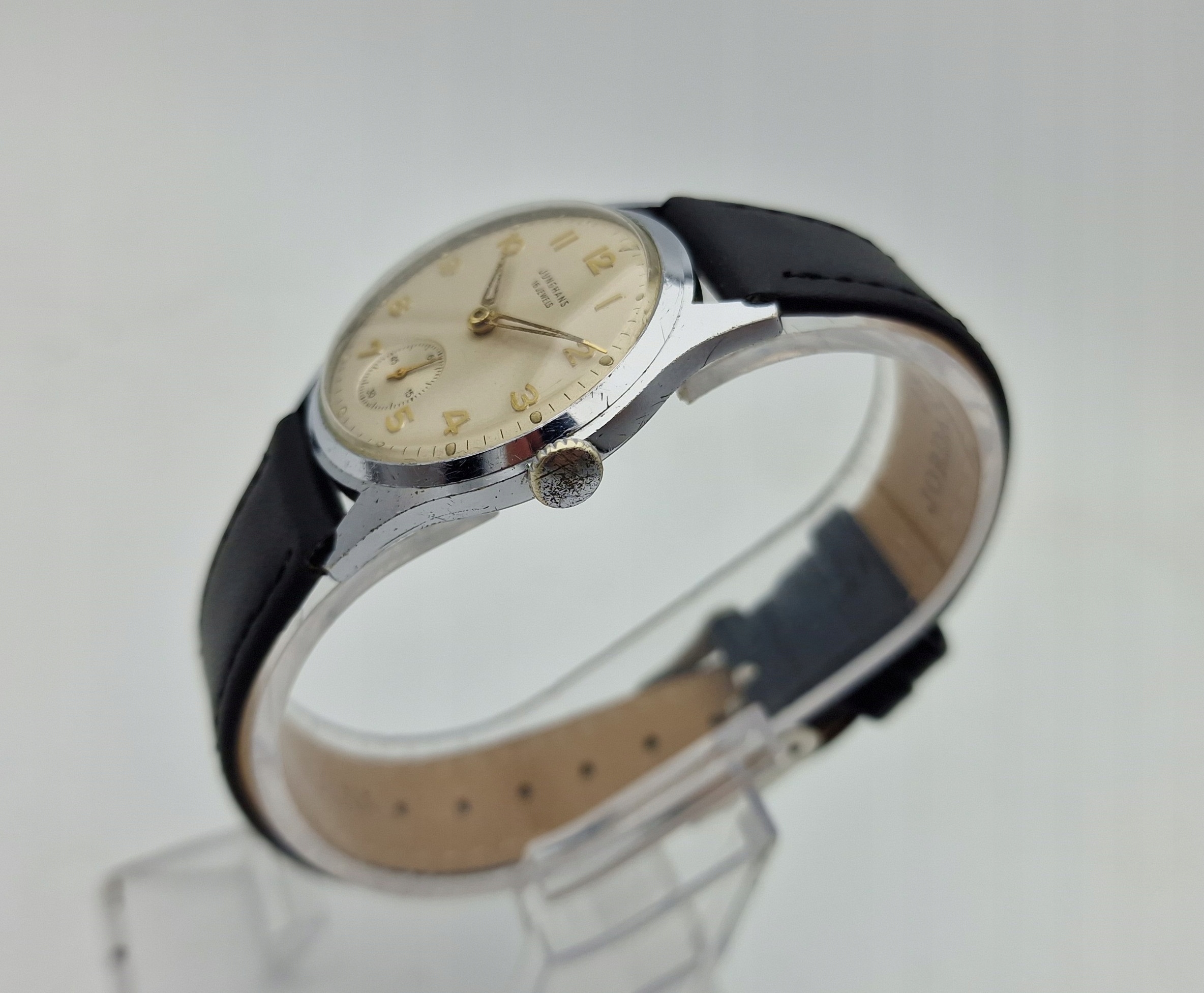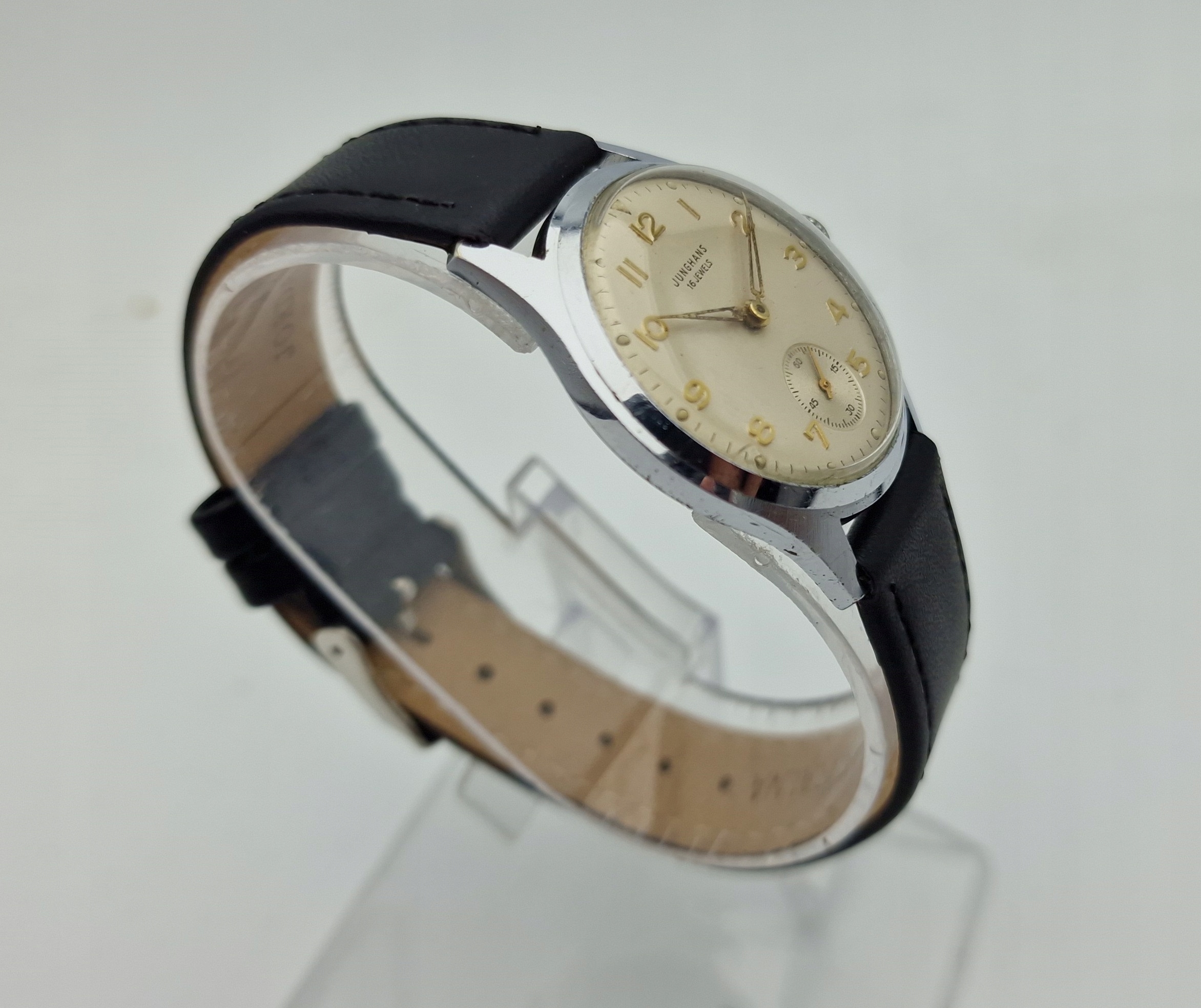 - Срібний металевий циферблат з окремою секундною стрілкою на шостій годині. Оригінальний циферблат із підписом: "JUNGHANS, 16 JEWELS". Циферблат майже в ідеальному стані, видно на фото.