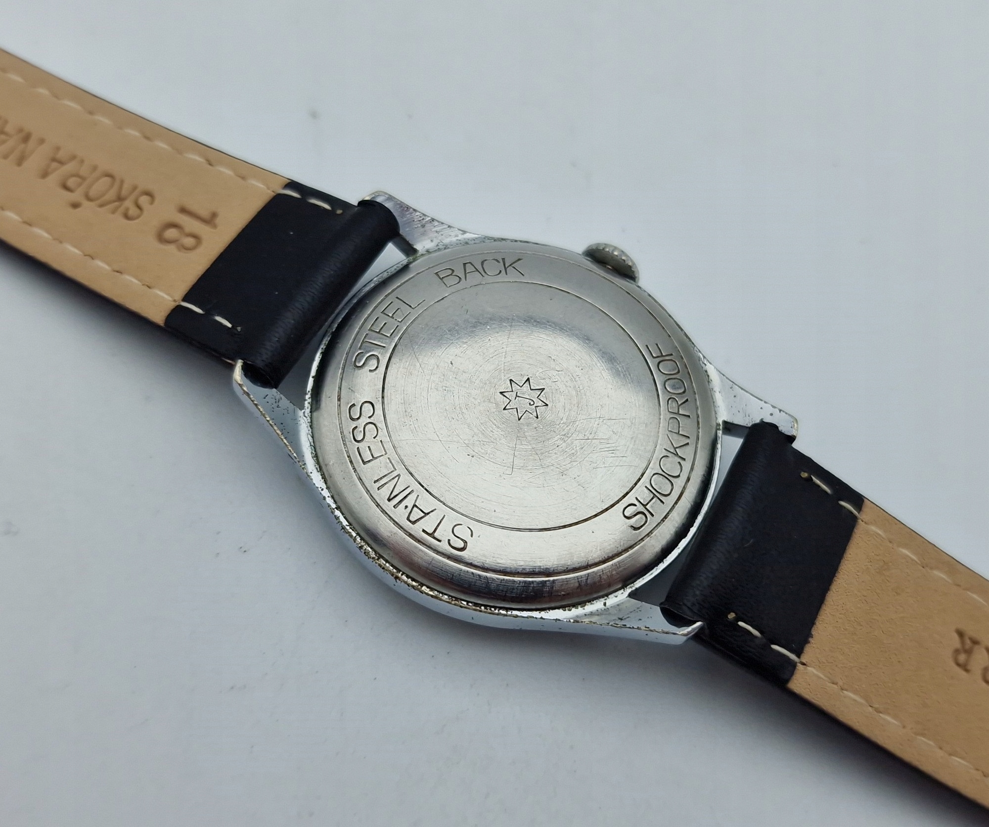 - Хромований корпус. Задня кришка затискається і має такі підписи: «ЗАДНЯ НЕржавіюча сталь, ударостійка, J». Оригінальне мереживо в ідеальному стані. Конверт майже в ідеальному стані, як на фото.