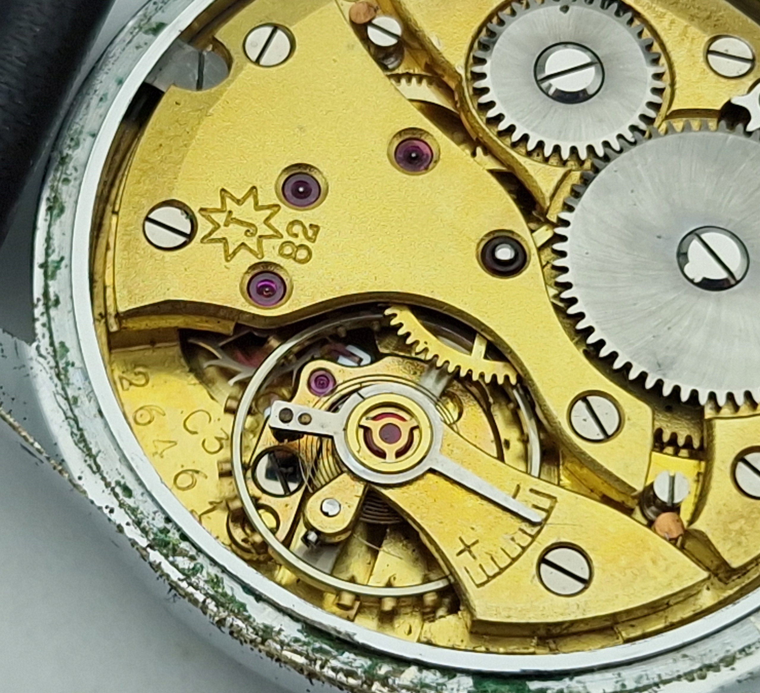 - Позолочений механізм годинника з 16 каменями, з анкерним спуском. На механізмі проставлені підписи: "J, 82". Механізм у хорошому та точному робочому стані, після огляду та обслуговування годинникарем, у відмінному стані.