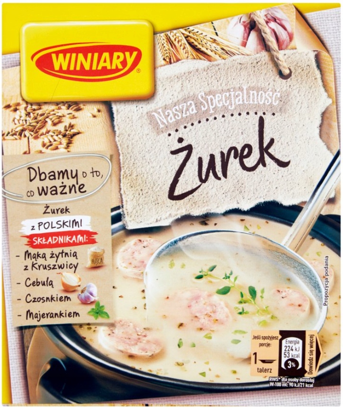 Журек – це традиційний польський суп на основі житнього борошна з додаванням спецій, таких як майоран, цибуля та часник. Winiary Żurek Our Specialty має приємну кислинку, збалансований смак і злегка кремову консистенцію. Це суп, без якого важко уявити великодній стіл, але він однаково смакує цілий рік, подається з різноманітними добавками. Він чудово смакує, якщо подавати його з яйцями, чіпсами з бекону, ковбасками кабанос або картопляним пюре.