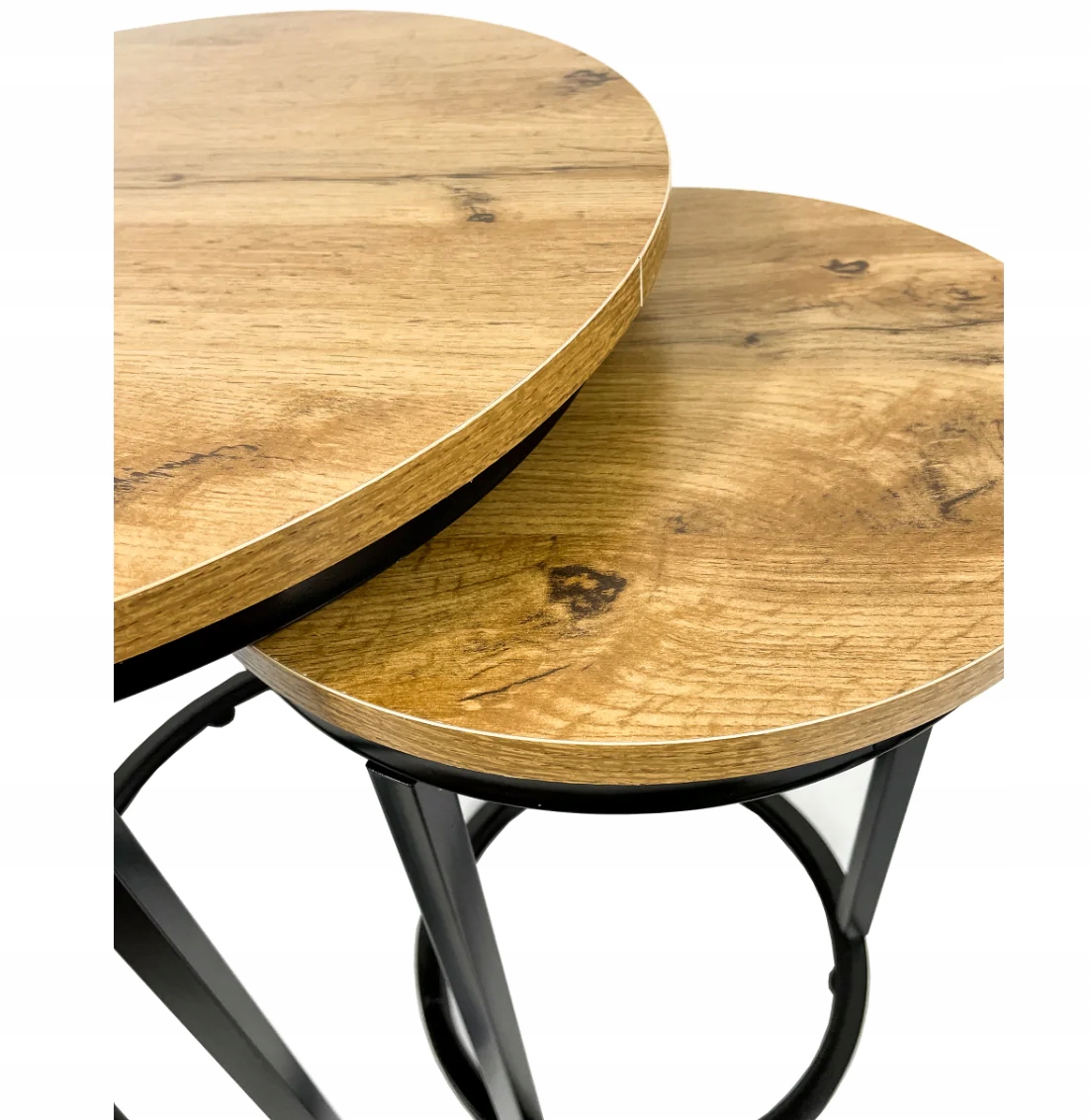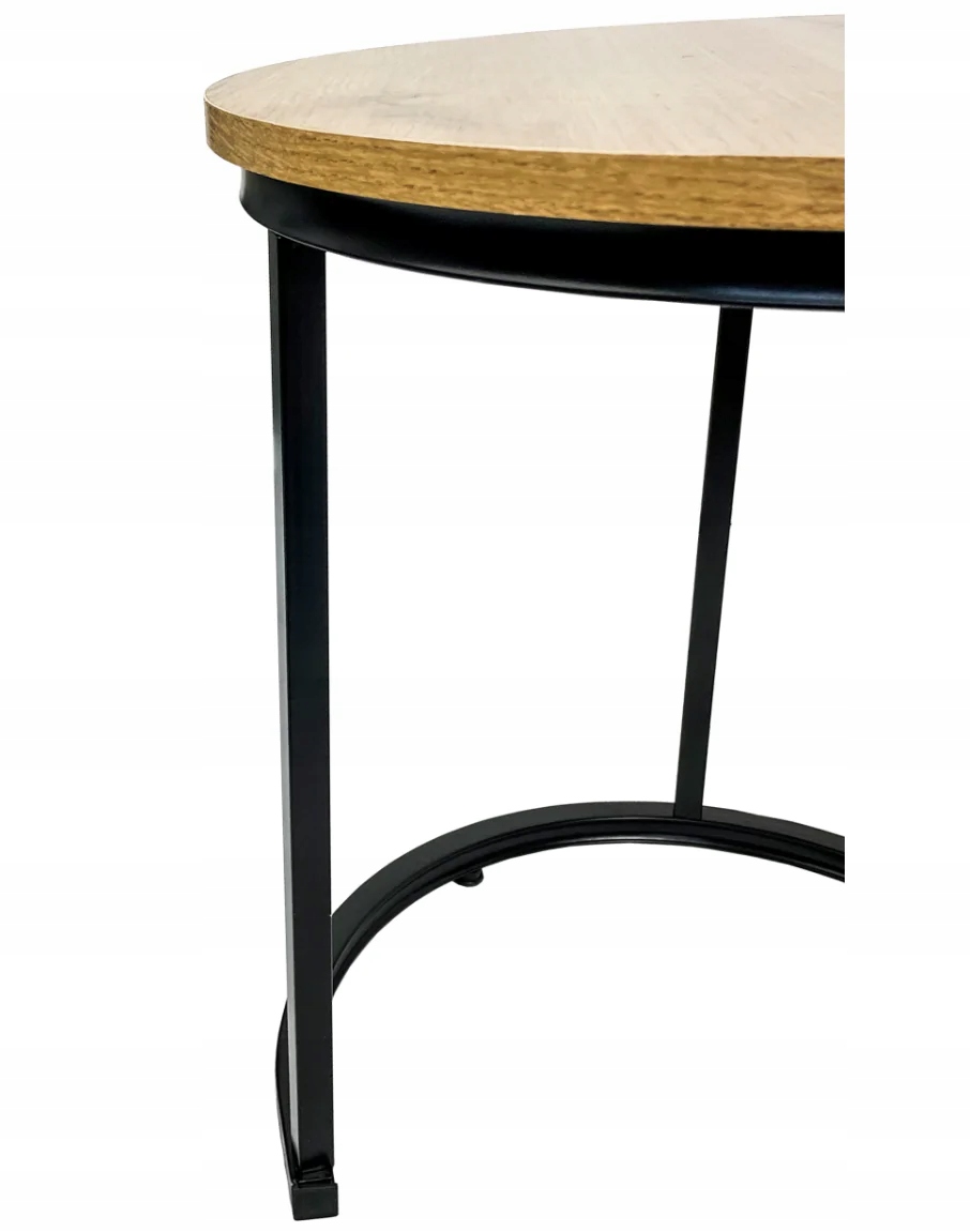 Практичні два столи зі сталевим каркасом для вітальні, кімнати чи спальні. Посилений внизу. Унікальний і унікальний промисловий вигляд. Легка та інтуїтивно зрозуміла установка. Стільниця кольору дуб. Чорні сталеві профілі, пофарбовані порошковою фарбою. Два столи забезпечують зручність використання та забезпечують. достатньо місця. Можливість підсунути менший стіл під більший. Матеріал: плита МДФ, металевий каркас чорного кольору. Розмір великого столу: fi 45x48см. Розмір меншого столу: fi 30x42см. Упаковка: коробка 49х47х9см