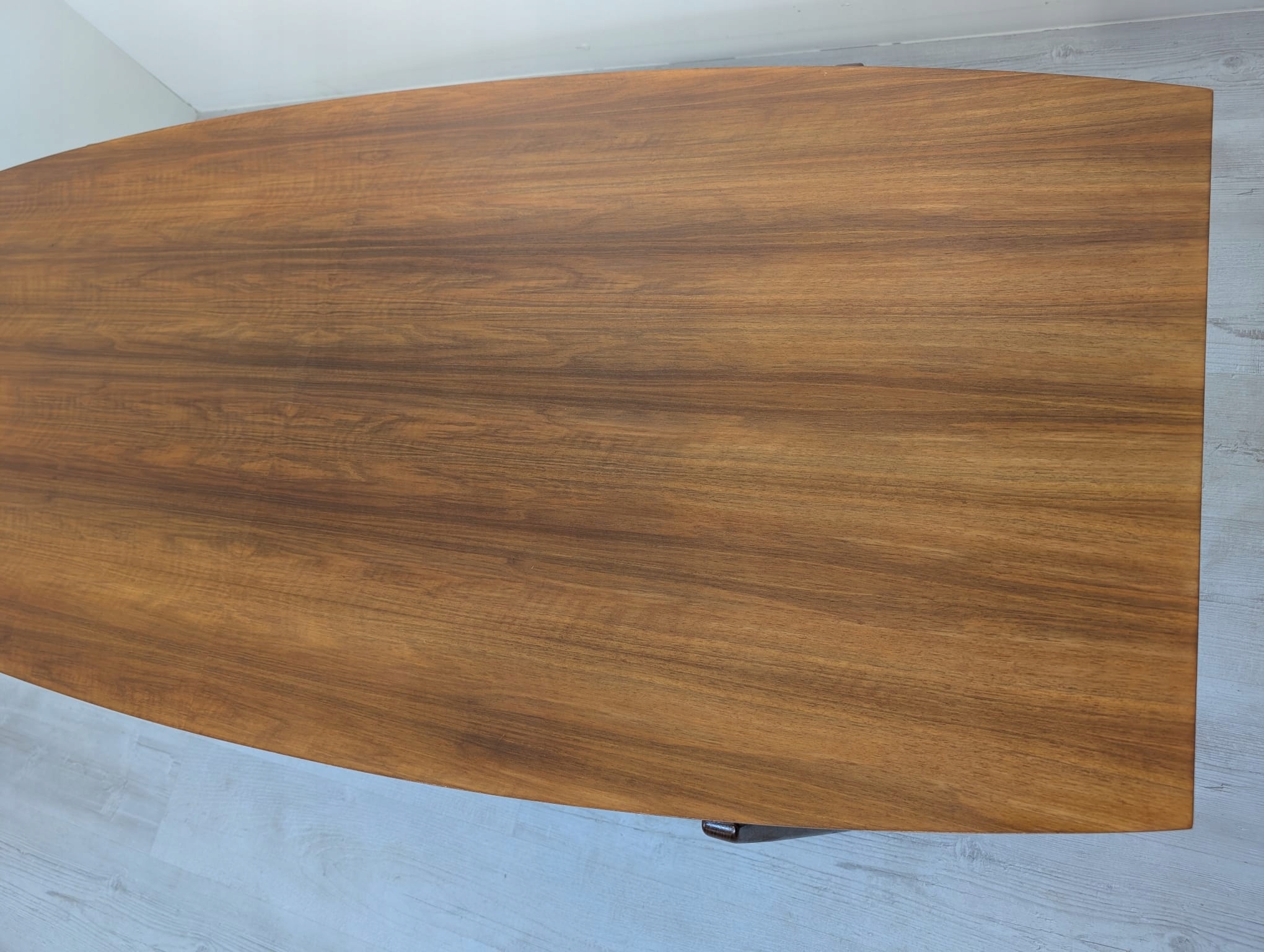Масивний стіл зроблений з міцних ніжок з тикового дерева, а верхня частина покрита тиковим шпоном.