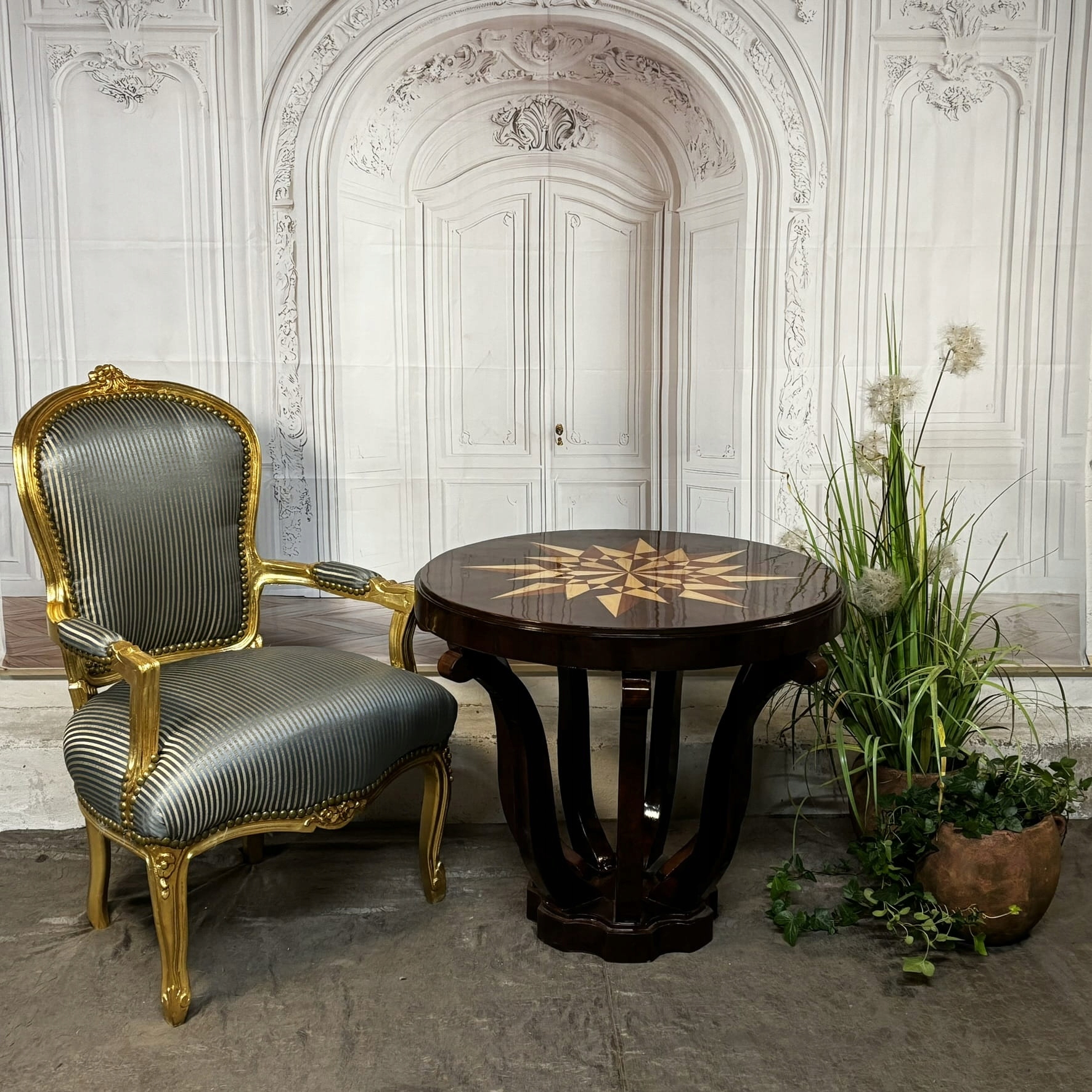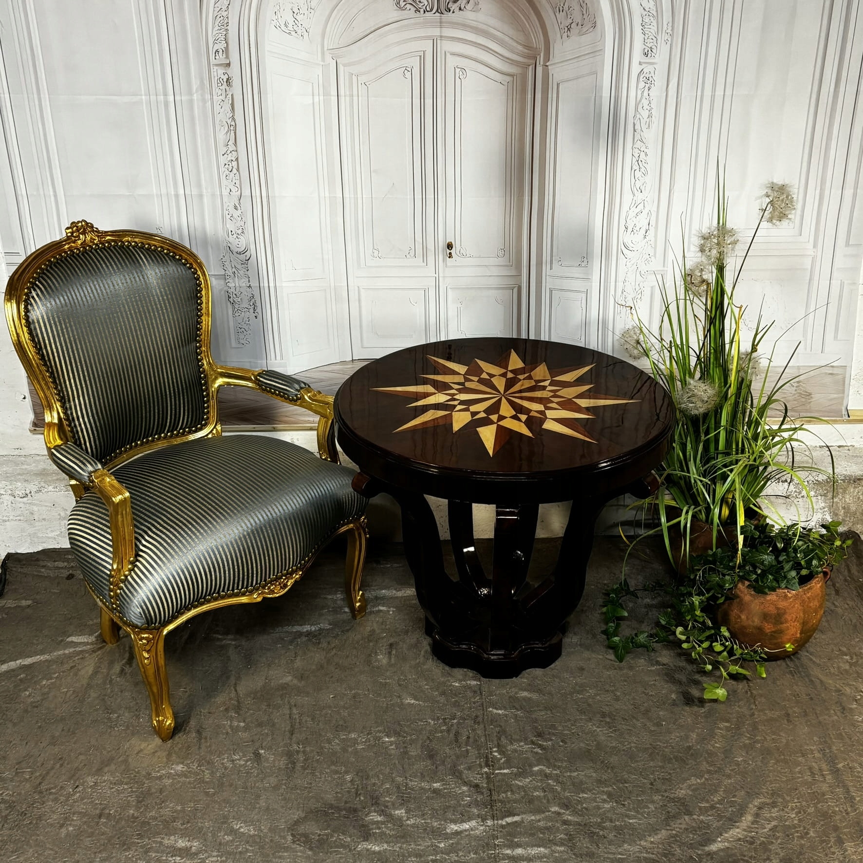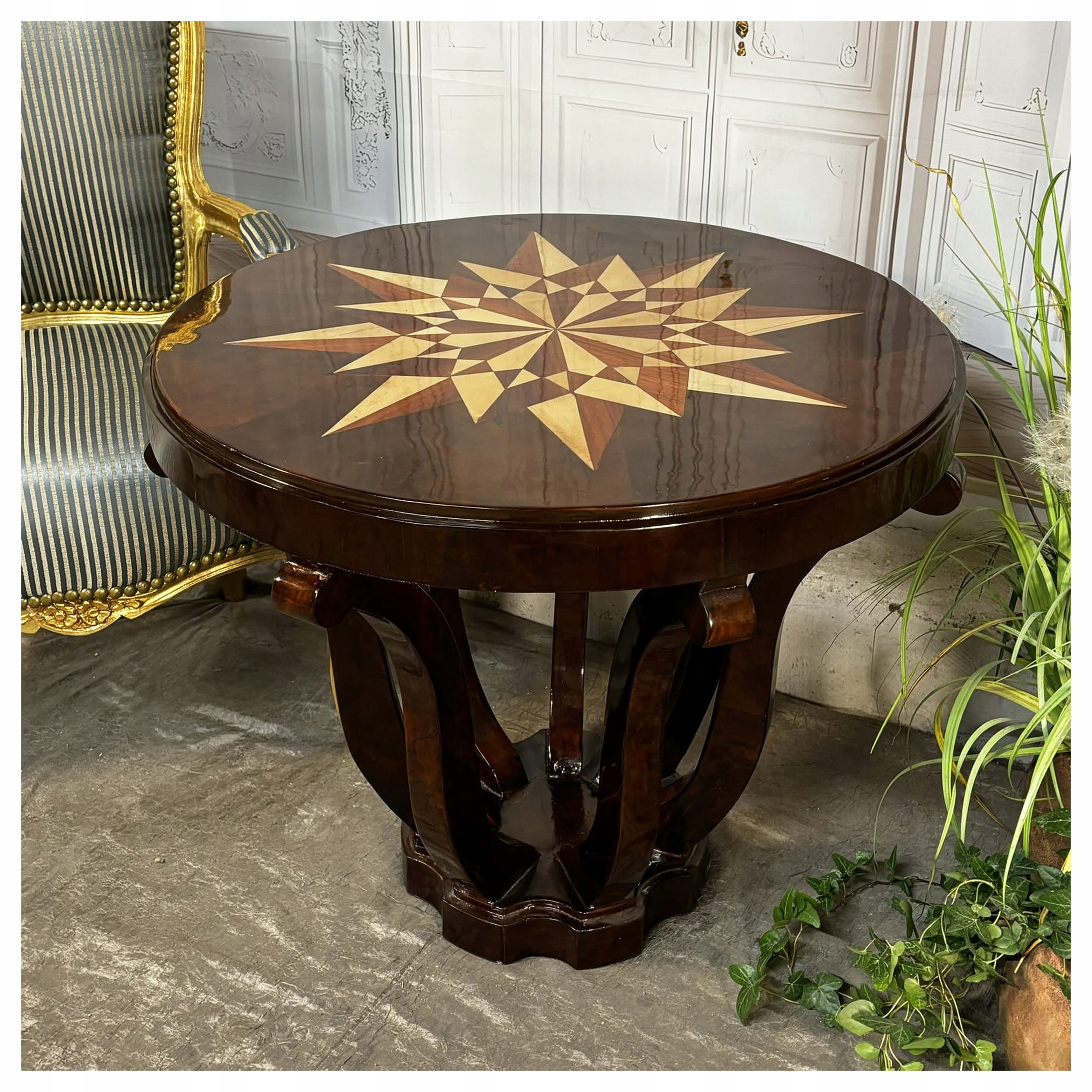 Введіть справжній розкішний символ - Цей таблиця арт -деко вражає як артистично, так і винятковим дизайном. Його круглий стільниця була прикрашена рукою -виготовленою зіркою, укладеною інкрустованою , що робить його надзвичайним твором прикладного мистецтва.