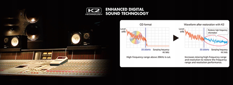 K2 — це оригінальна технологія JVC, яка відтворює оригінальний основний звук шляхом розширення частотного діапазону. Наприклад, K2 розширить цифрові дані аудіо компакт-диска, записаного на 44,1 кГц, до 192 кГц. Також можна відтворити діапазон високих частот понад 20 кГц, який обрізається під час форматування компакт-диска.