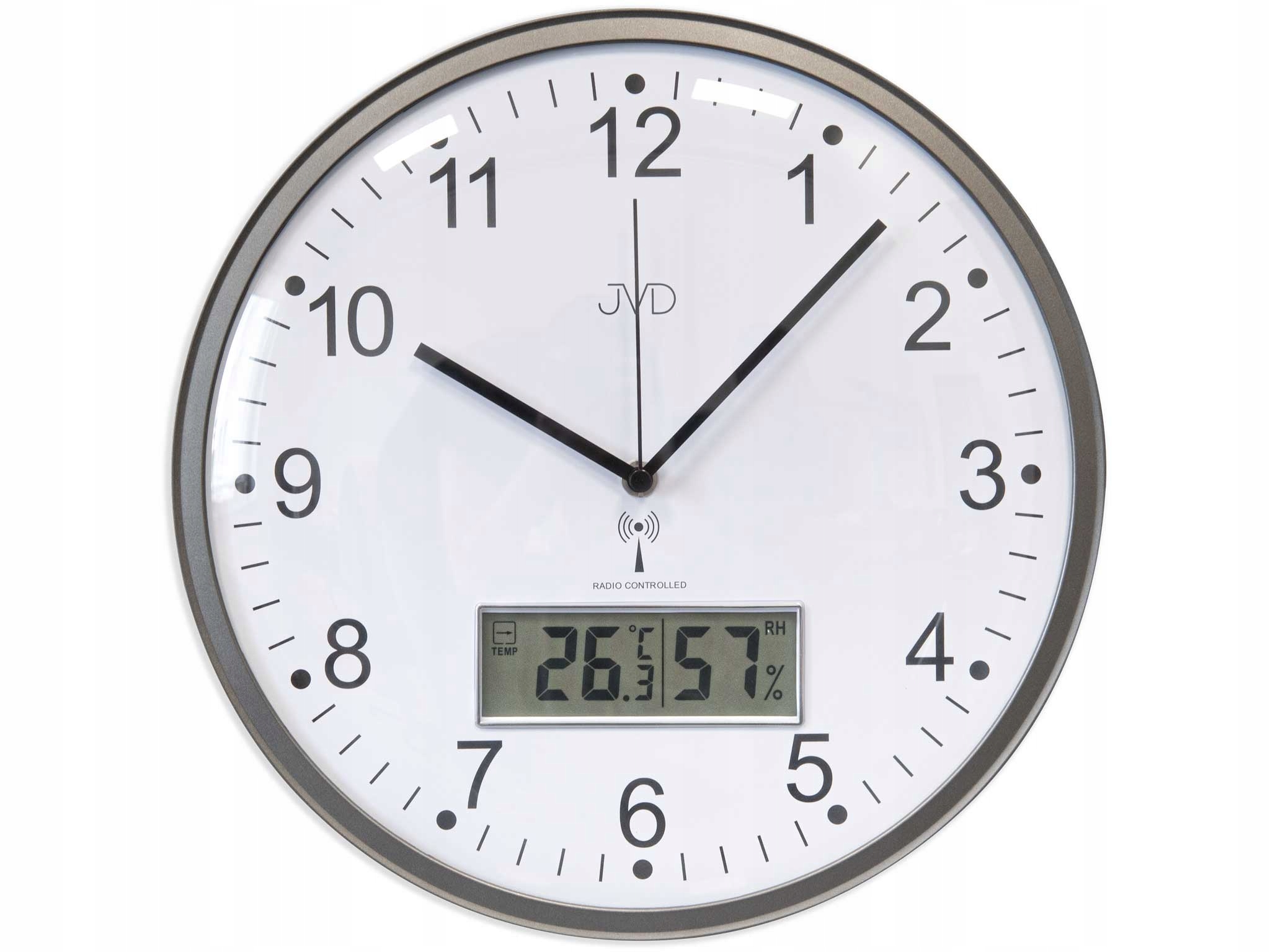 годинник JVD RH78.2 - класична модель, збагачена корисними функціями. На круглому читаному щиті є цифровий дисплей, відповідальний за функцію термометр , який надає температуру всередині приміщення, а також датчик вологості повітря. Прозорі чорні арабські номери були розміщені на білому щиті. Завдяки функції радіо управління годинник підключається до атомного годинника і автоматично встановлює правильний час. Ми додаємо акумулятори до набору безкоштовно.