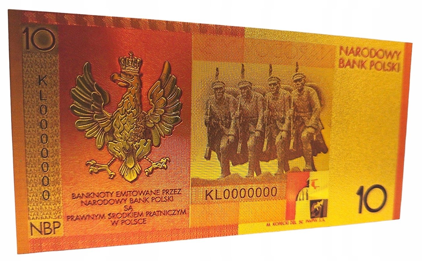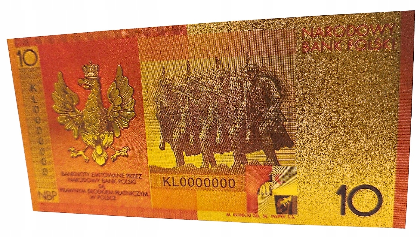Репліка першої польської колекційної банкноти, виготовлена з ПВХ і покрита із золотою фольгою .