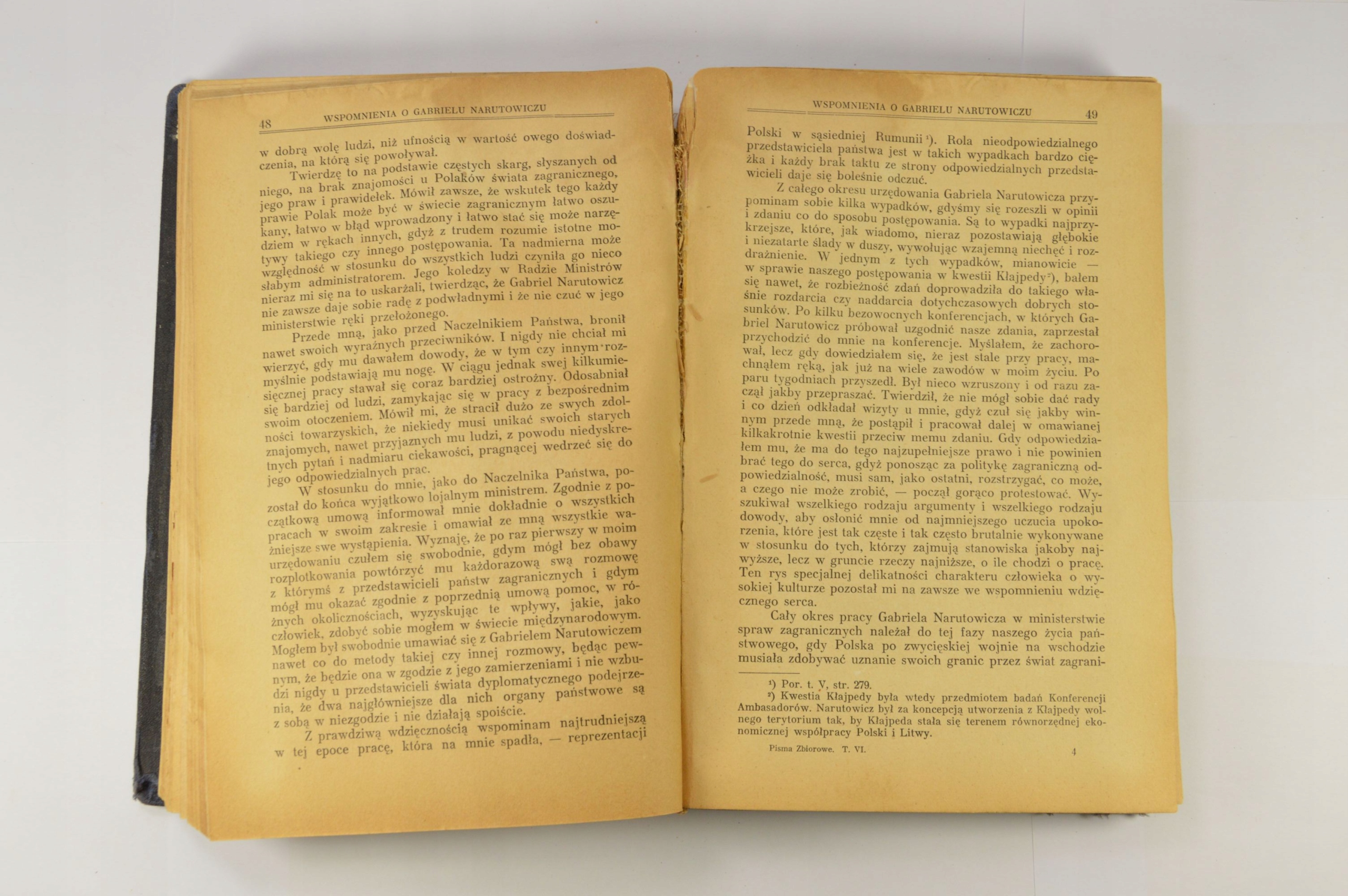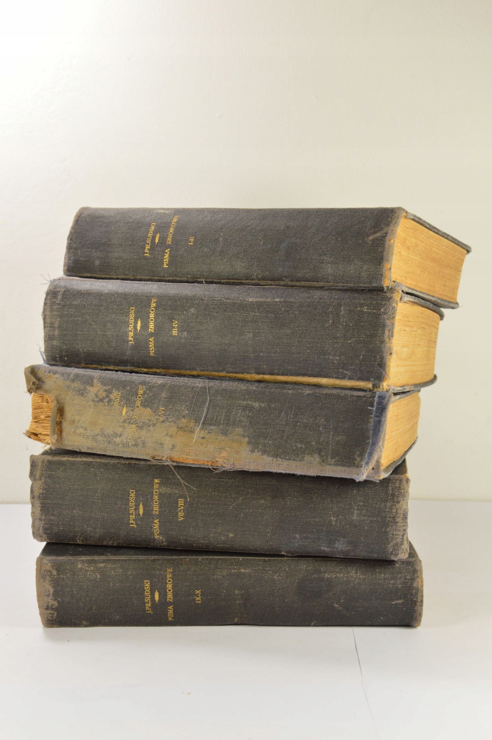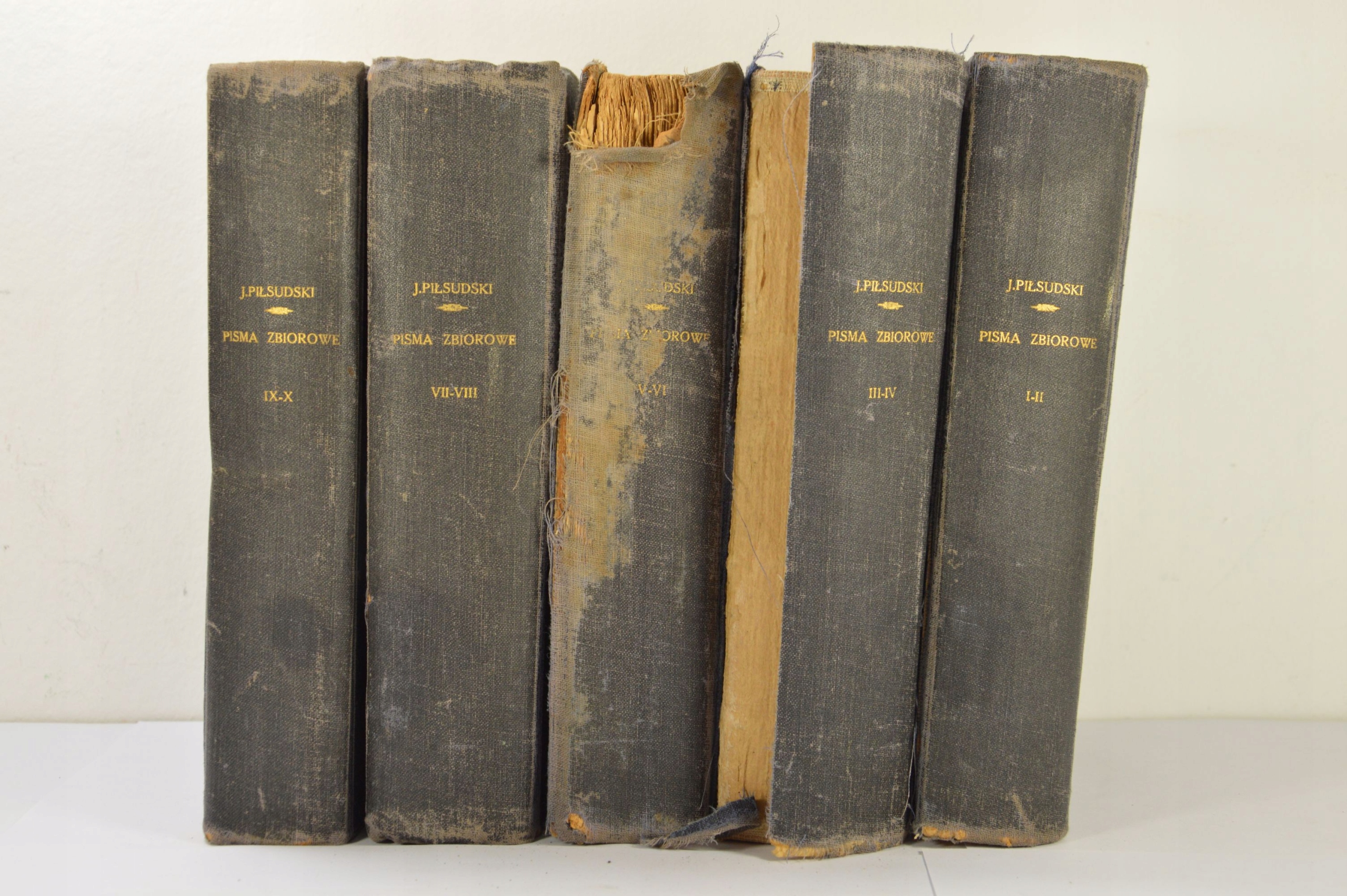 Оригінальне довоєнне видання в 10 томах, Pisma Zbiorowe - Юзеф Пілсудський. Видавництво Інституту Юзефа Пілсудського, Варшава 1937. Тверда обкладинка, палітурка, обтягнута тканиною, підпис Олександра Наркевича Вільнюс. Повні томи, томи III-IV з ослабленим корінцем і передньою палітуркою, томи V-VI після часткового затоплення з видимими плямами на сторінках і пошкодженням палітурки.
