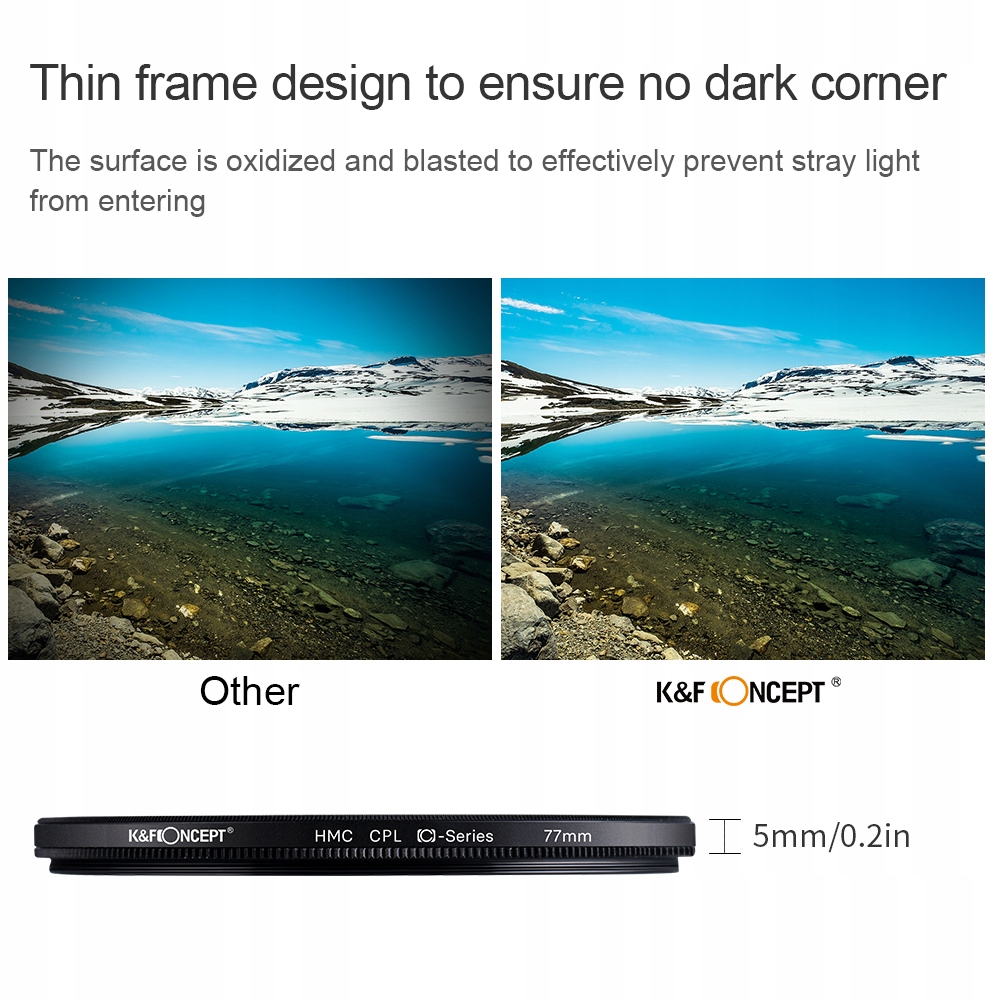 - Ультратонкий профіль обода щоб уникнути віньєтування на ширококутних об’єктивах, і водночас можна обертати, щоб регулювати рівні поляризації