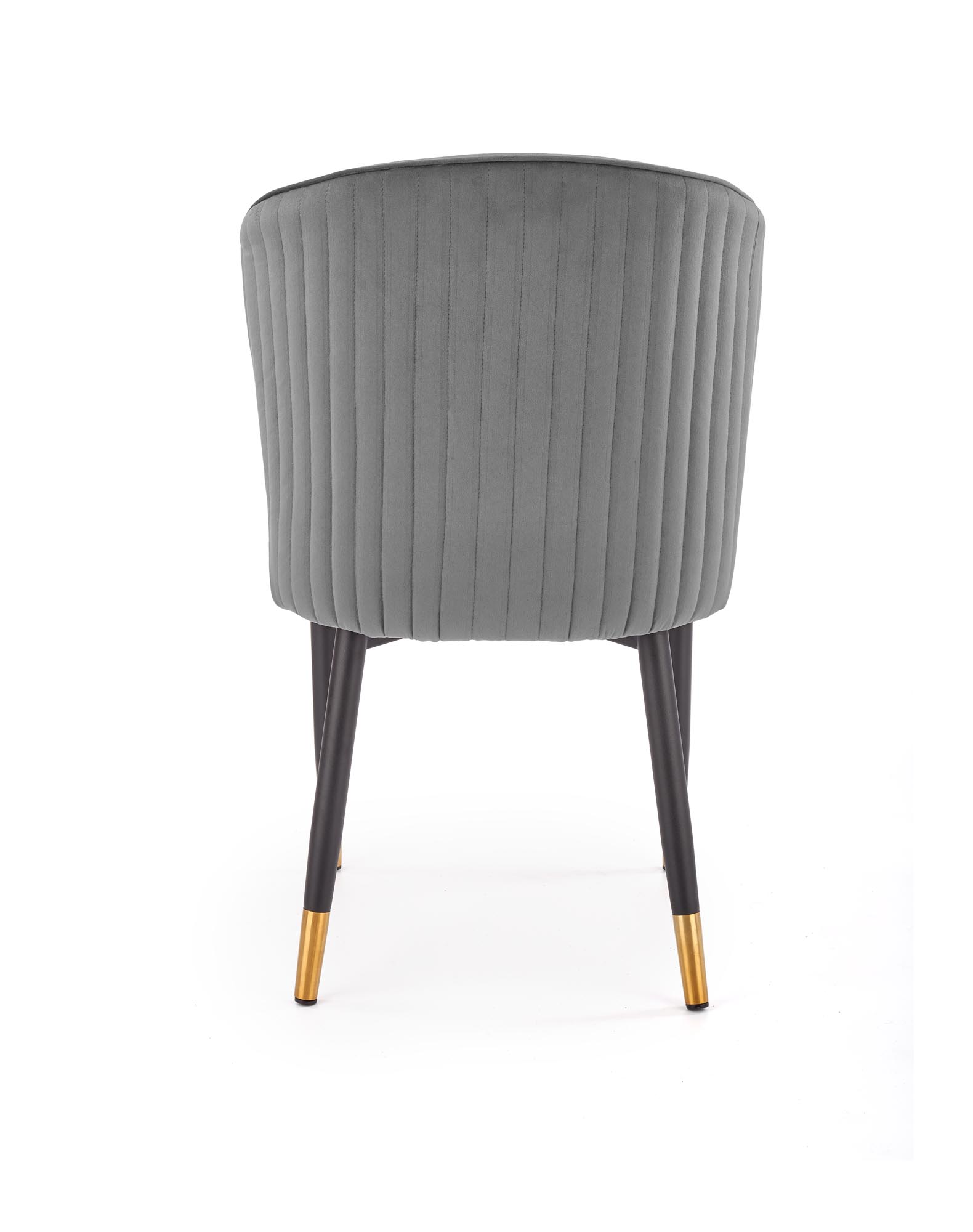 КріслоK446- ідеальне рішення для сучасного та гламурного інтер'єру. Міцний сталевий каркас крісла виготовлений зі сталі з порошковим покриттям чорного кольору з золотою вставкою в нижній частині з хромованої сталі. Сидіння і спинка оббиті високоякісною тканиною VELVET зі зниженим поглинанням рідини попелясто-сірого кольору. Дизайнерська конструкція в поєднанні з надійною обробкою гарантує міцність меблів протягом багатьох років.