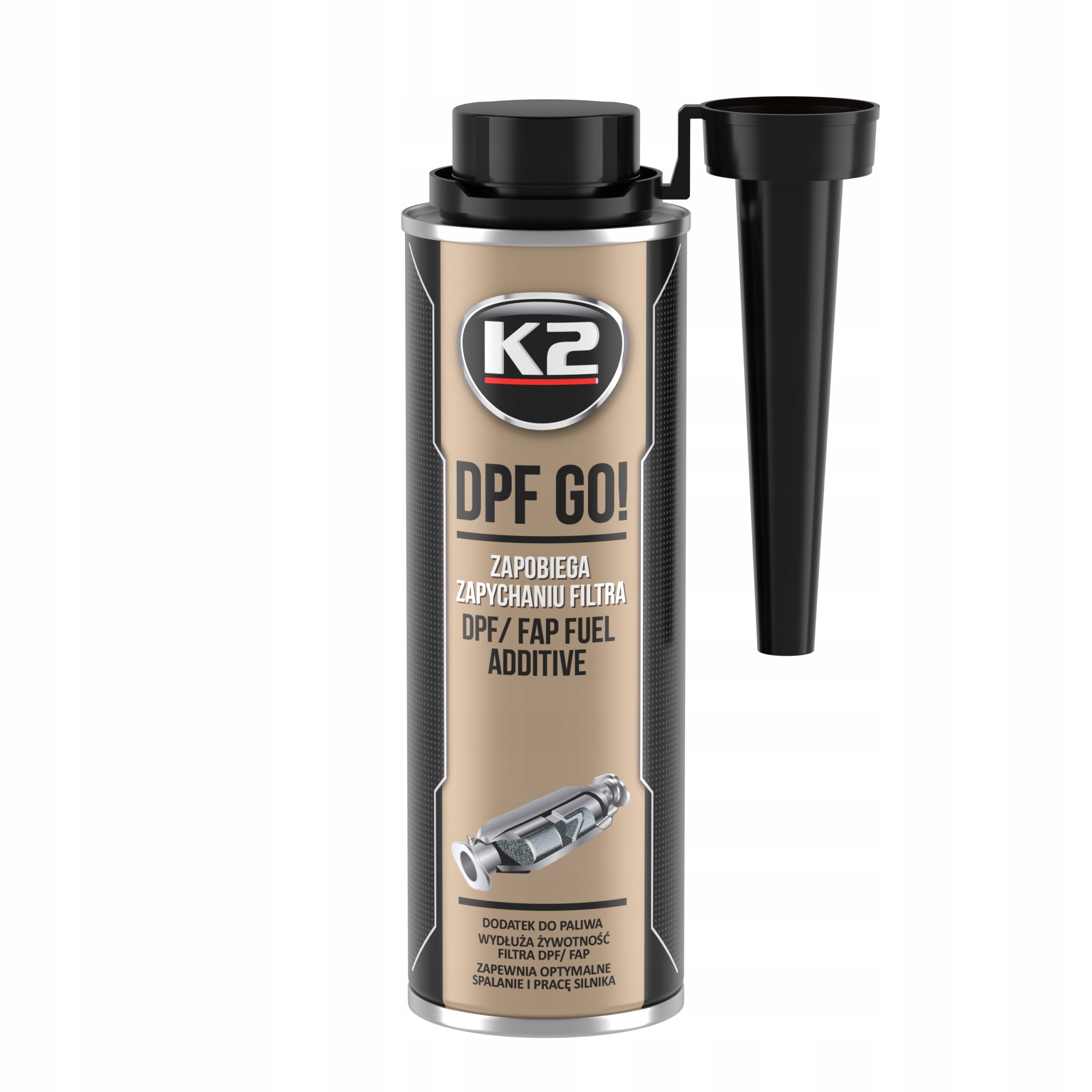 k2 dpf go! 250 мл - це доповнення до дизельного дизеля, розробленого для ефективного захисту фільтра твердих частинок DPF / FAP, завданням якого є зловживання сажі, що виникає в процесі згоряння в сучасних дизельних двигунах. Вихлопний газ, який покращує споживання палива і позитивно впливає на термін експлуатації фільтра.