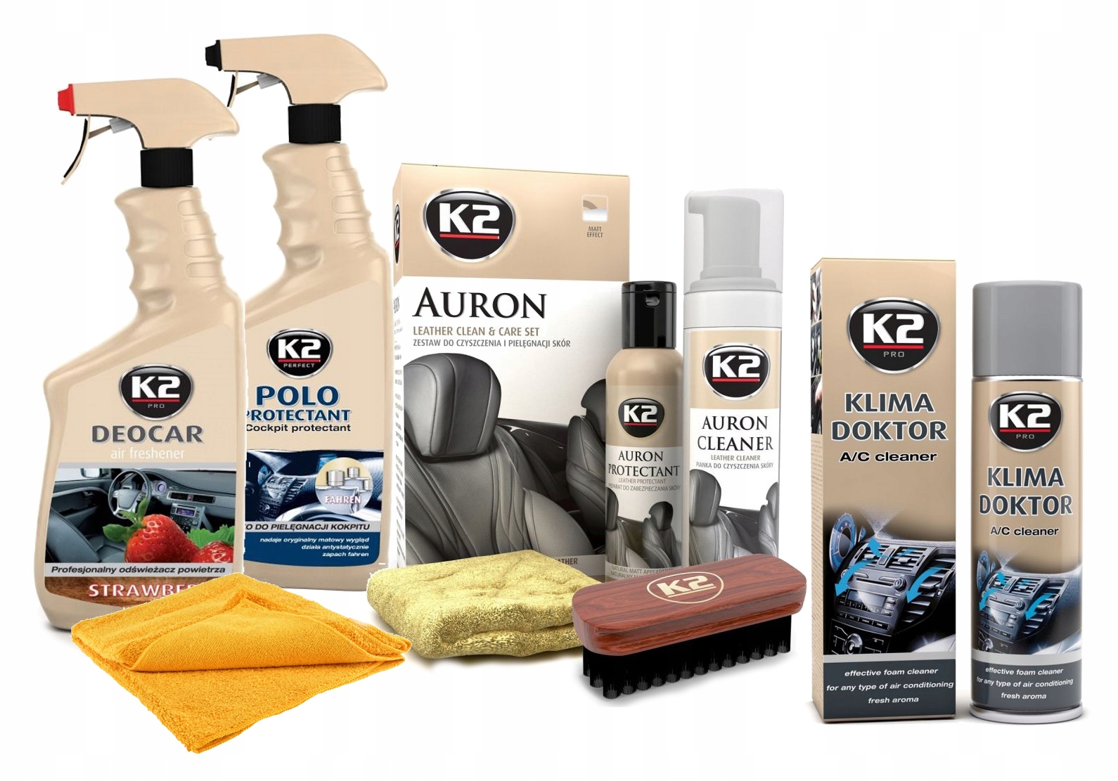 Набір для догляду за шкірою K2 Auron — це пакет із чотирьох унікальних продукти, розроблені для того, щоб зробити шкіряну оббивку м’якою, відновити її природний, матовий вигляд і захистити від стирання та розтріскування. Формула та форма продуктів були підібрані для забезпечення максимальної ефективності та ефективності, зберігаючи виняткову простоту використання. З набором K2 Auron догляд за шкіряною оббивкою надзвичайно простий, незалежно від рівня знань про автокосметику.
