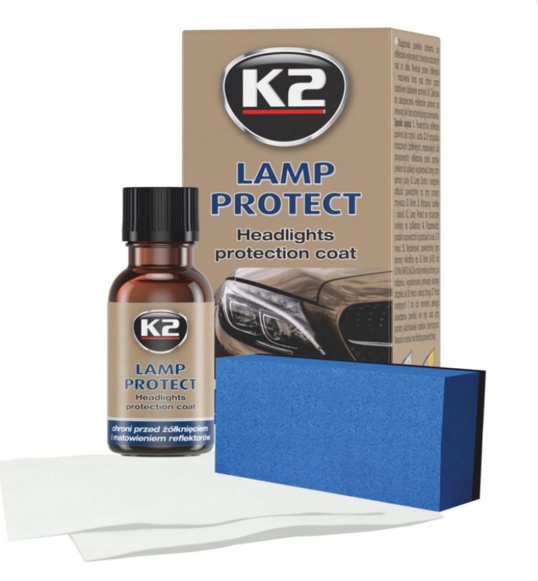 K2 LAMP PROTECT - довговічне захисне покриття, призначене для фар із пластику та скла. Запобігає пожовтінню та тьмянінню ламп. Захищає від шкідливого впливу УФ-променів. Зберігає поверхню лампи чистою, відштовхуючи воду та полегшуючи видалення бруду. Захищає фари від легких подряпин.