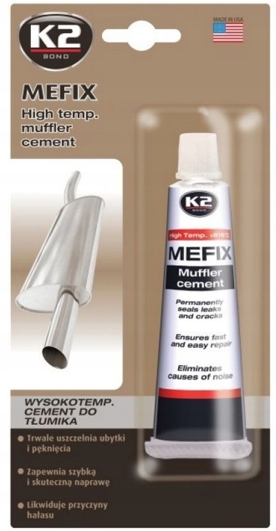 K2 MEFIX - високотемпературний цемент, призначений для монтажу та ремонту як нових, так і старих систем, вихлопних труб і каталітичних нейтралізаторів. Закриває отвори та тріщини. Під впливом високої температури він твердне, як сталь. Легко поширюється. Після застигання не дає усадки і не кришиться, водонепроникний.