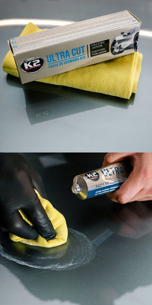 K2 ULTRA CUT - легка абразивна паста для видалення подряпин, подряпин і недоліків фарби. Ідеально вирівнює поверхню. Ефективно працює на всіх типах і кольорах лаків - традиційних і металізованих.