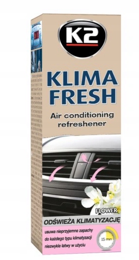 K2 KLIMA FRESH надзвичайно ефективний і простий у використанні освіжувач повітря. Усуває неприємні запахи, викликані брудом і вологою в системі вентиляції. Весь процес займає не більше десятка-іншого хвилин. Підходить для всіх типів кондиціонерів. Залишає свіжий аромат після використання.