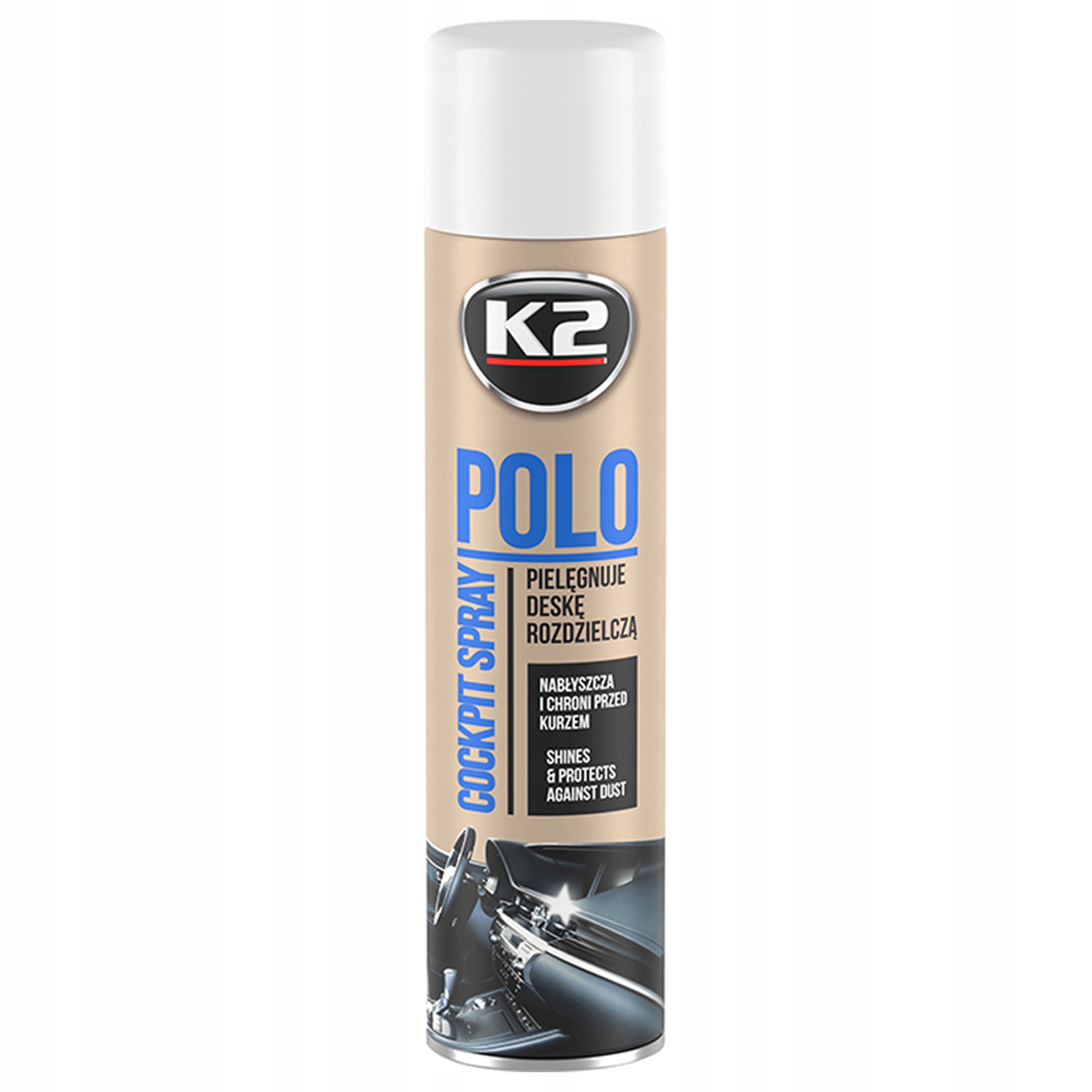 K2 polo кабіни - спрей для догляду та обслуговування приладової панелі. Він містить спеціальні наночастинки, завдяки якому він легко і швидко захистить всю кабіну, відновлює глибокий колір та виразну текстуру очищених елементів.
