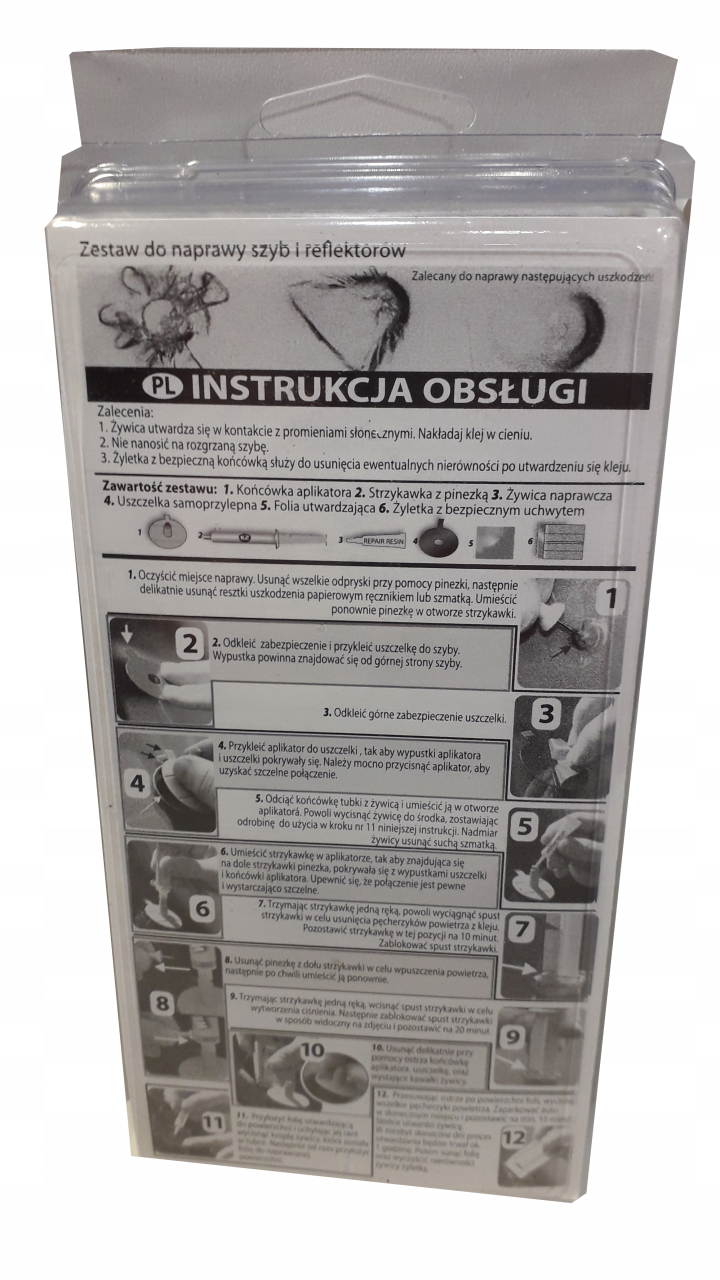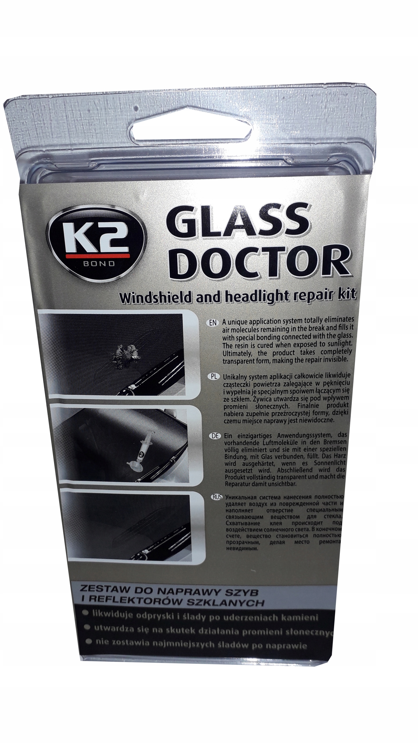 Унікальна система нанесення повністю усуває частки повітря, що залишаються в тріщини та заповнює їх спеціальним зв’язуючим, що з’єднується зі склом. Смола твердне під впливом сонячних променів. Зрештою, продукт набуває абсолютно прозорої форми, що робить місце ремонту непомітним.