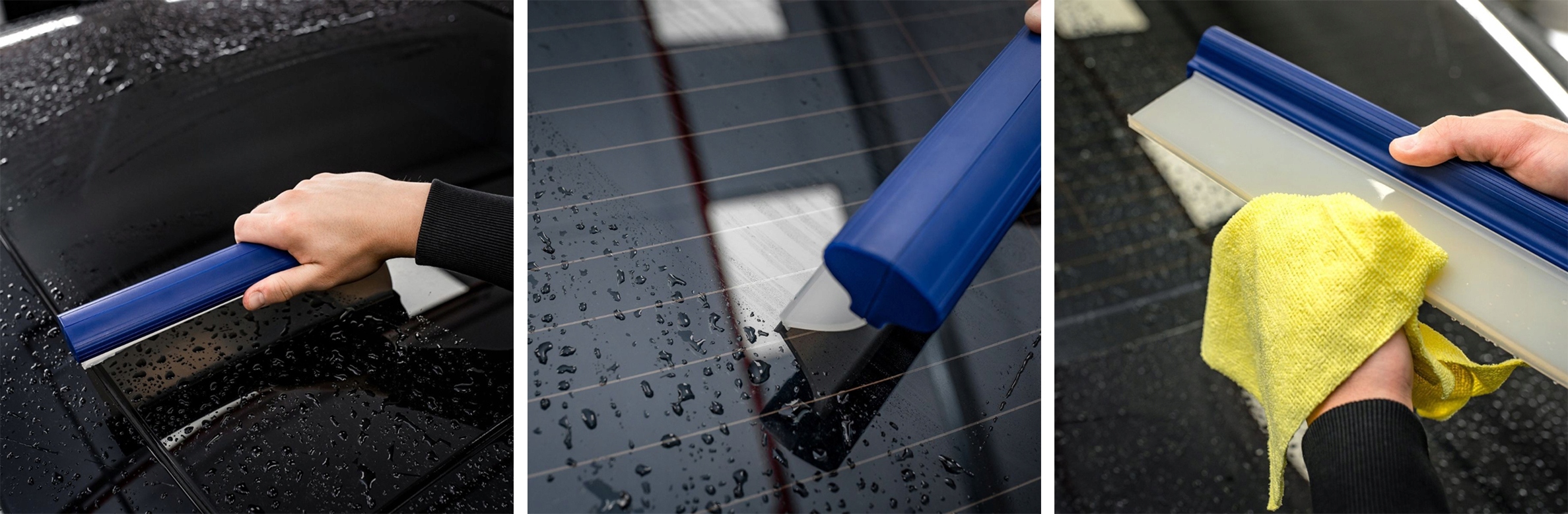 Ракель — ідеальний спосіб висушити автомобіль удвічі швидше. Завдяки силіконовій ручці краплі води стікають з тіла, залишаючи його сухим і без смуг.