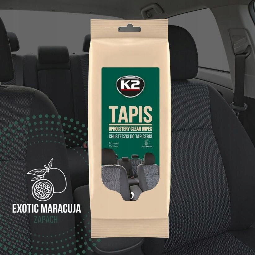Очищення автомобіля серветками для чищення оббивки K2 TAPIS підсилює привабливий аромат екзотичних фруктів з ноткою маракуйї.