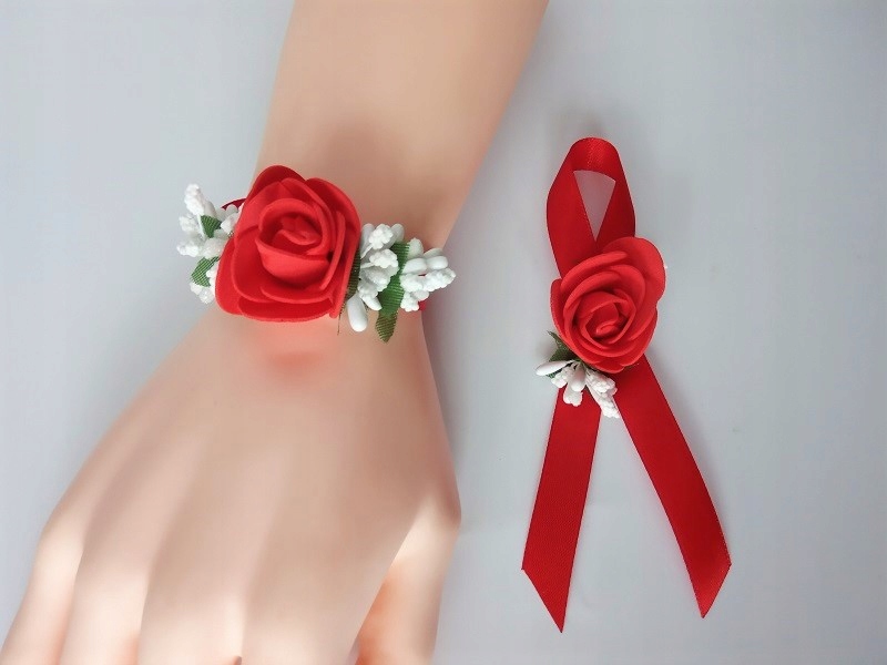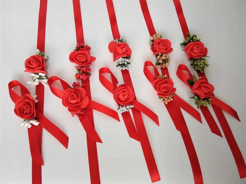 * червоного кольору атласні стрічки шириною приблизно 12 мм і довжиною приблизно 40 см,